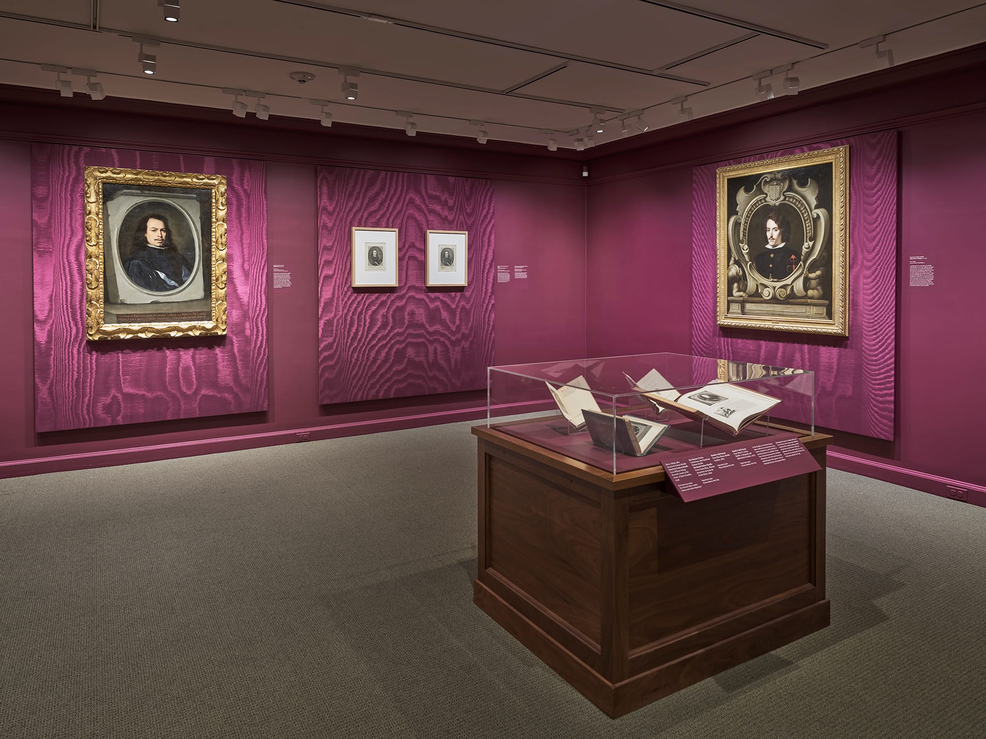 The show at the Frick is divided into two facing basement galleries (wallpapered in a regal purple for the occasion), with the two self-portraits hanging prominently, one in each gallery, on opposite walls facing the doorways. Each is surrounded by other similar Murillo portraits, as well as prints copied after the self-portraits, helping disseminate the artist’s image across Europe. In the center of the room lie some of the original books that contained these prints.