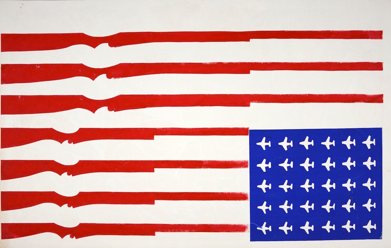 Many feature brusque slogans — “End War Now” and “Fascist Infested,” for instance — while others offer images that require no written explanation to convey their bold messages. One features the flag of the United States, with the stars representing the 50 states replaced by orderly fighter jets and its red stripes morphed into sleek rifles. Drawing from art history, another poster takes Goya’s early-19th-century “Saturn Devouring His Son” as its model, with the Chronos figure identified as “Amerika.” The results of rapid efforts executed through a production line and produced on recycled computer paper, material scavenged from trashcans, and old cardboard bits that often quickly made their way to demonstrations in the streets, the posters reflect a widespread urgency to not only express frustrations through creative means but to also disseminate such concerns to a wider public.
