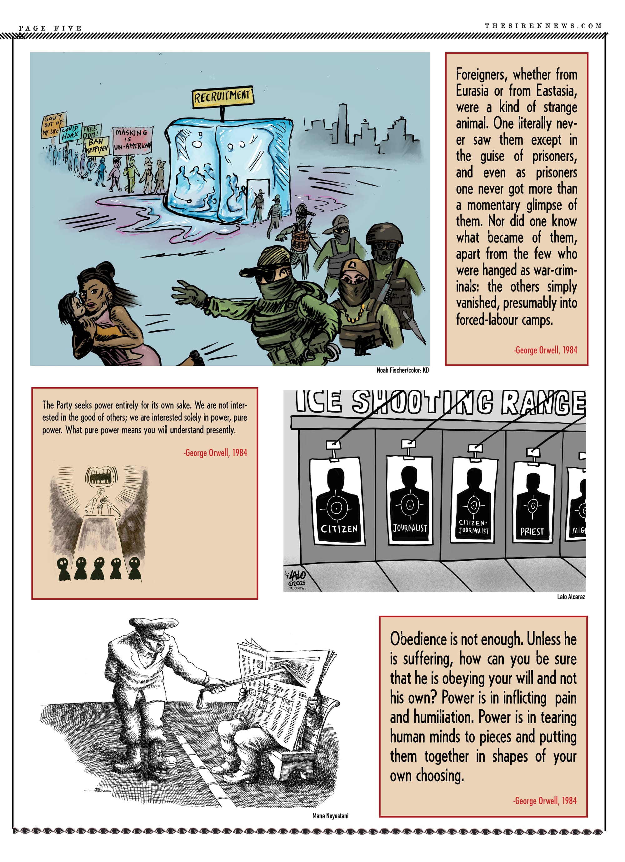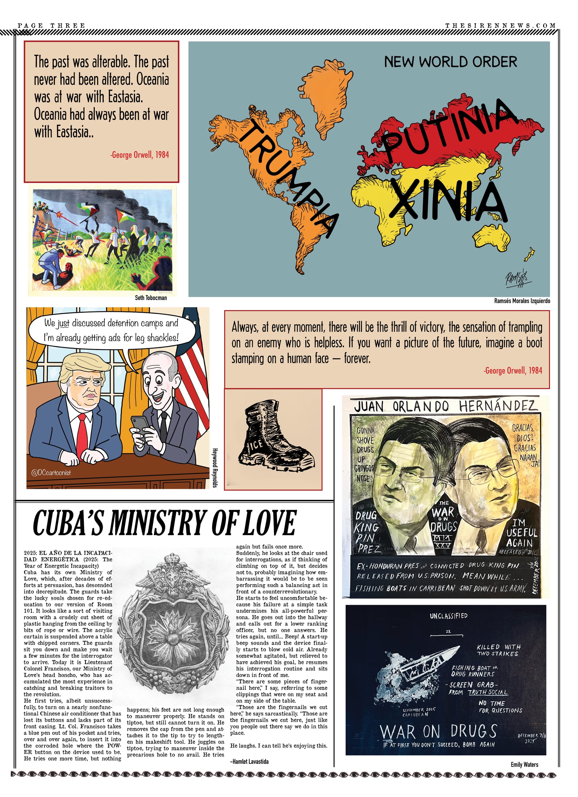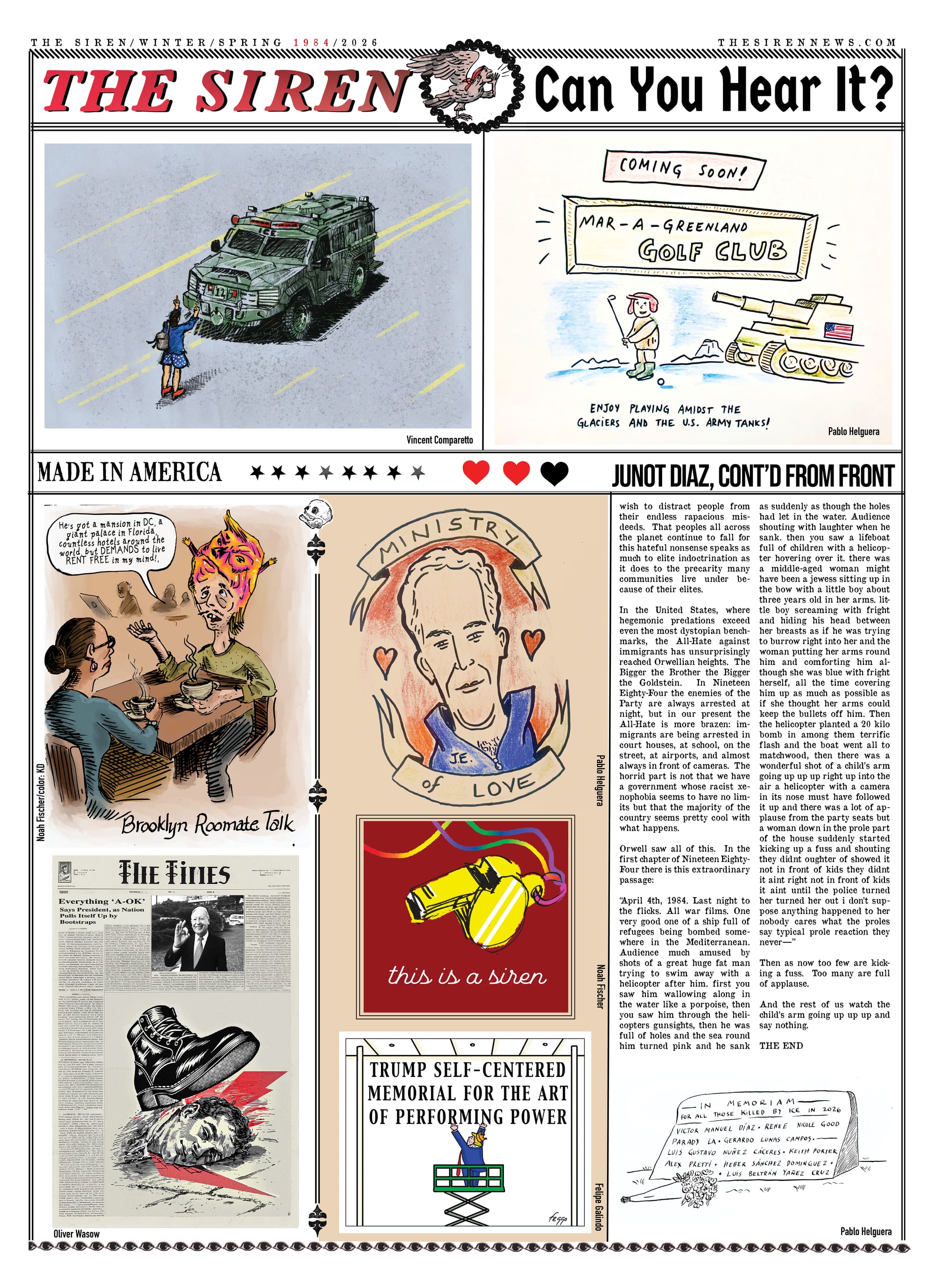 The editors of The Siren have been thinking about the parallels between our current political moment and the dystopian world of George Orwell’s novel 1984 for quite a while, but the escalating efforts by the Trump Administration to wage war against immigrants and silence critics compelled us to devote our latest issue to highlighting those connections. After witnessing the killing, torture, and forced expulsion of immigrants by federal agents, as well as the execution of US citizens and the criminalization of activists, we have no choice but to conclude that Orwell’s "Hate Week" has arrived. We’ve done our best to bring the perspectives of those who are under attack, and who have survived totalitarian regimes, to the foreground. Writers Junot Diaz, Enrique Del Risco, and Pamela Sneed shed light on the ways that authoritarianism is taking over our world. Political cartoonists hailing from Iran, Cuba, Venezuela, the Philippines, and the Americas offer their perspectives on the impact of tyrannical forces in our lives.