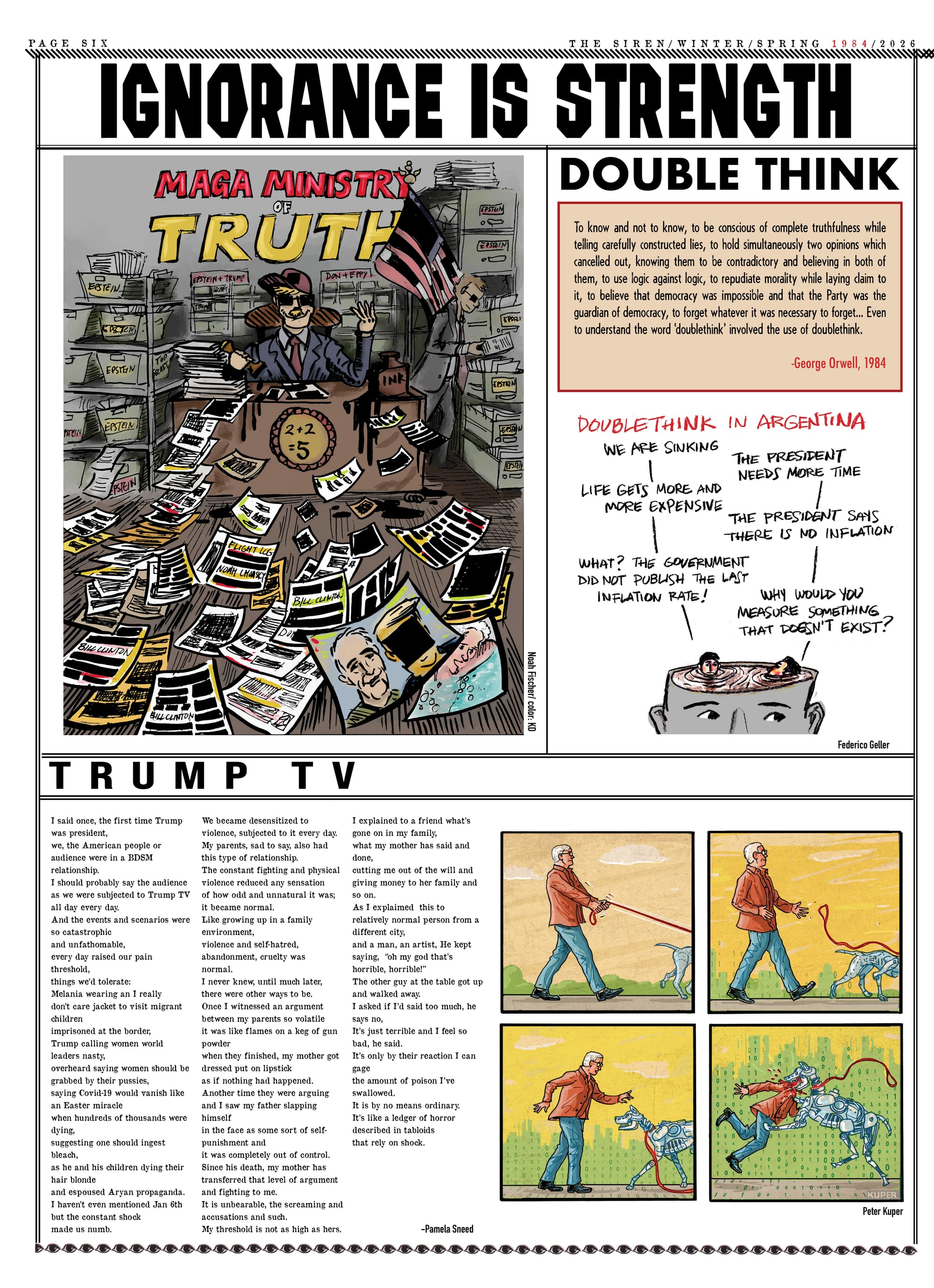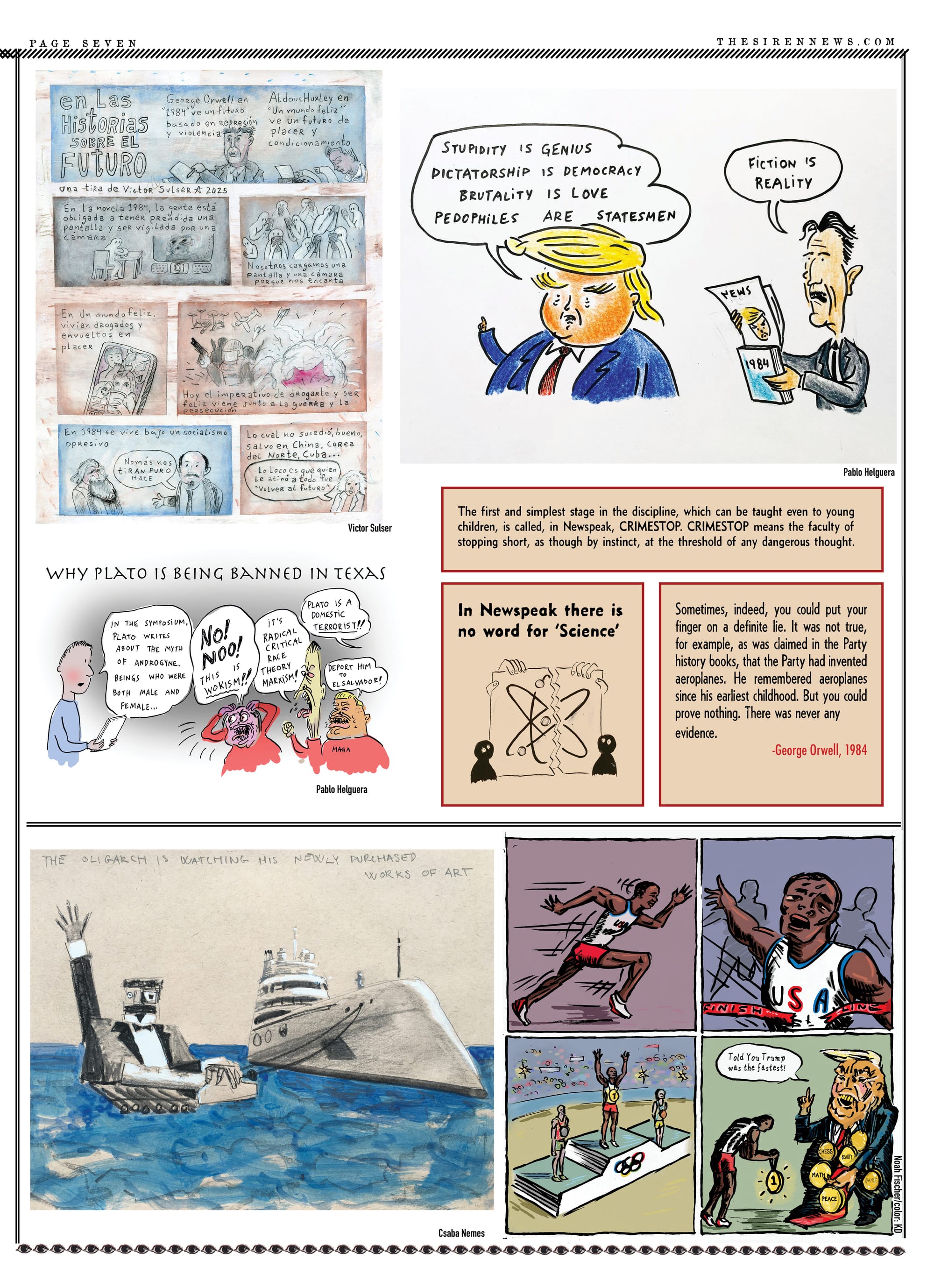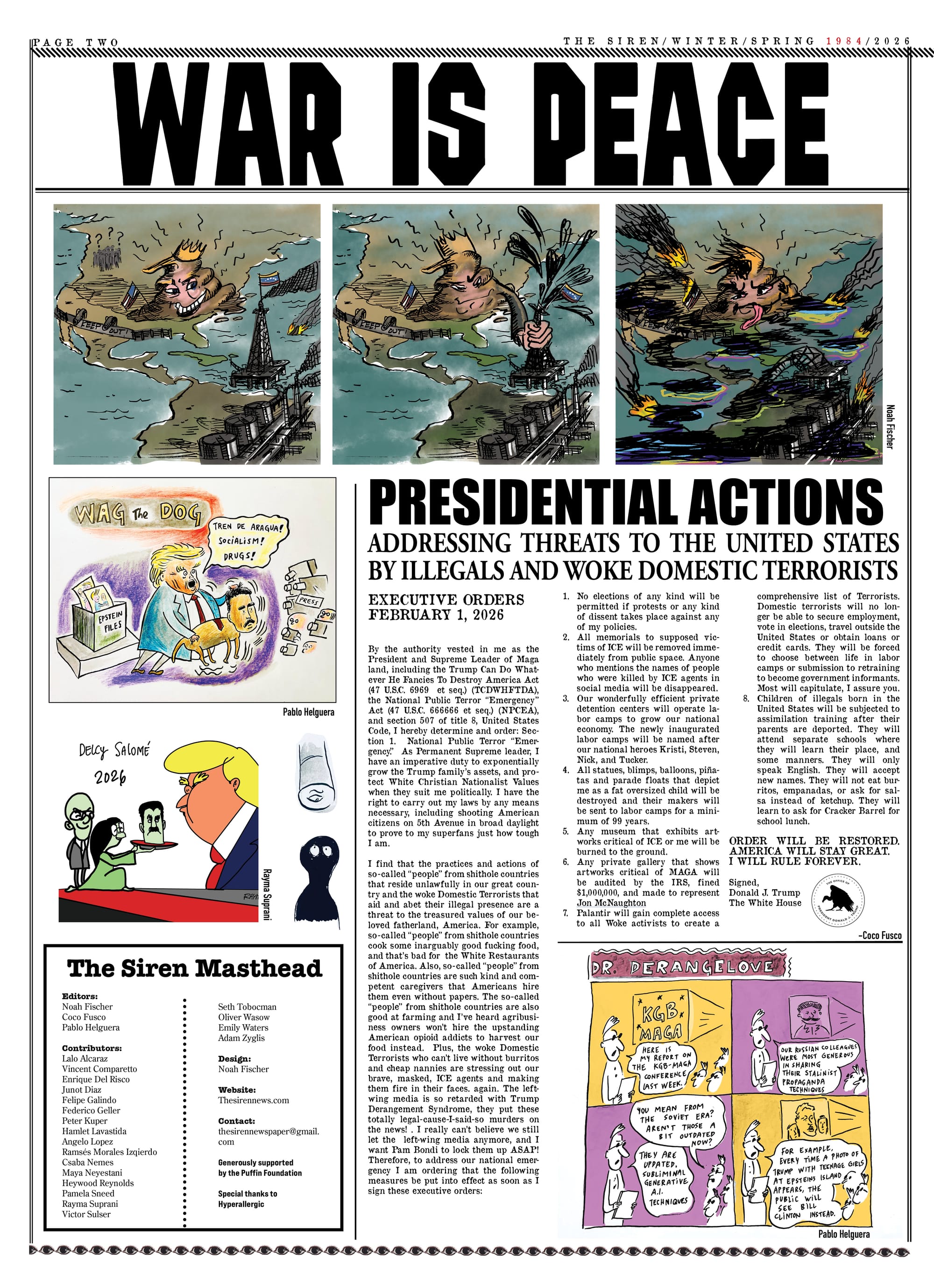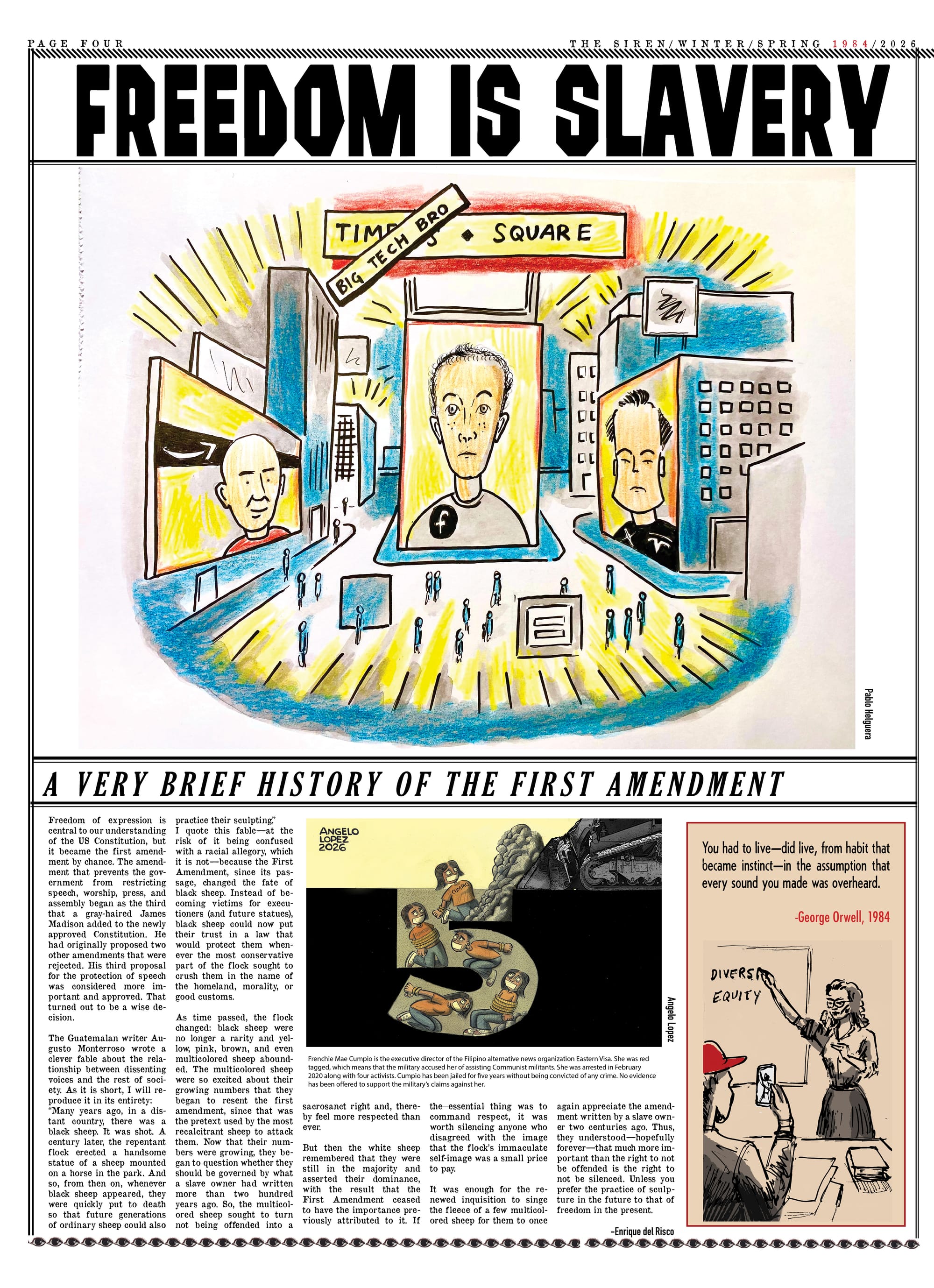 The editors of The Siren have been thinking about the parallels between our current political moment and the dystopian world of George Orwell’s novel 1984 for quite a while, but the escalating efforts by the Trump Administration to wage war against immigrants and silence critics compelled us to devote our latest issue to highlighting those connections. After witnessing the killing, torture, and forced expulsion of immigrants by federal agents, as well as the execution of US citizens and the criminalization of activists, we have no choice but to conclude that Orwell’s "Hate Week" has arrived. We’ve done our best to bring the perspectives of those who are under attack, and who have survived totalitarian regimes, to the foreground. Writers Junot Diaz, Enrique Del Risco, and Pamela Sneed shed light on the ways that authoritarianism is taking over our world. Political cartoonists hailing from Iran, Cuba, Venezuela, the Philippines, and the Americas offer their perspectives on the impact of tyrannical forces in our lives.