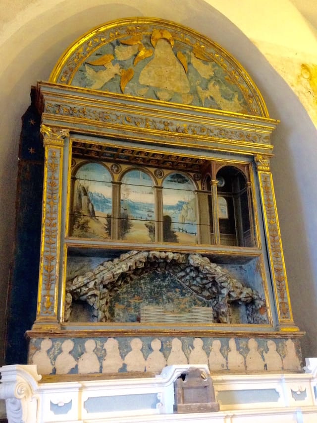 The simplicity of the interior draws your eye immediately to the large, imposing altarpiece — I estimated it to be seven and a half to eight feet tall — a captivating combination of painting, gilding and woodcarving, with a trompe l’oeil midsection of a Renaissance arcade overlooking a landscape that recedes into the blue haze of atmospheric perspective. Below the painted panel is a crèche, and above it is a lunette with the Madonna and angels. Thirteen figures, presumably Christ and the Apostles, line up along the bottom edge.
