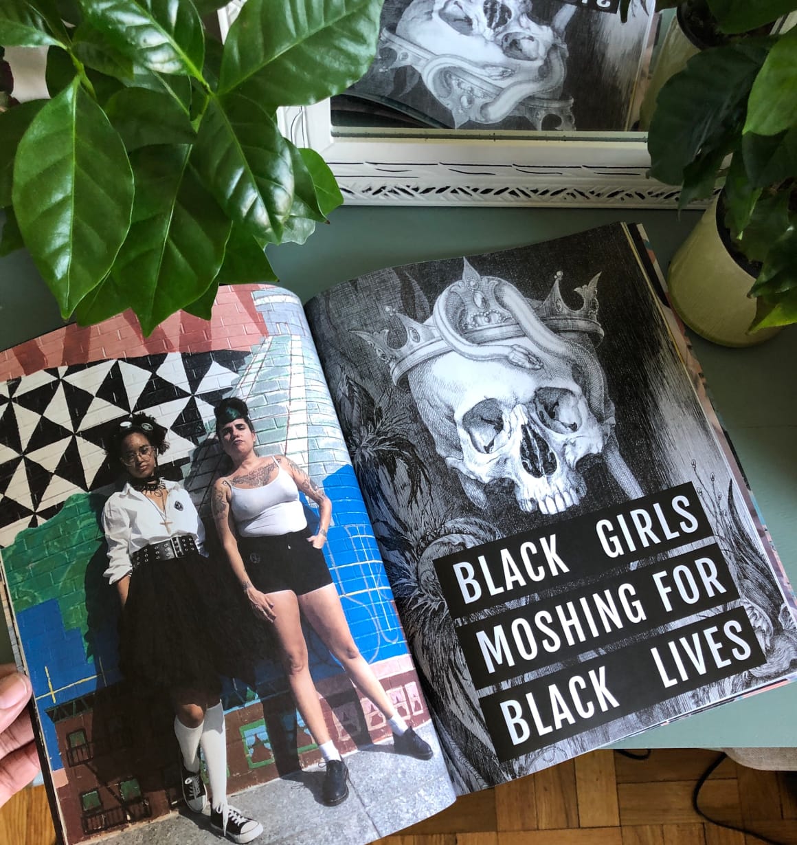 Other works on view embody the DIY spirit of the zine, which historically has been a mode for creative voices outside of the mainstream to distribute their ideas. This kind of independent publishing is a way to share art freely, on one’s own terms. See #BLKGRLSWURLD a small press based in Harlem, “celebrating and documenting Womxn of Color in the Heavy Music scenes.” Through photographs, interviews, and fantastic illustrations, #BLKGRLSWURLD spotlights the diversity within the metalcore, hardcore, punk, and black metal genres. Or, check out Julia Arredondo’s self-help zine, Guide to Being Broke and Fabulous, which is exactly what it sounds like. On a spread titled “Coping: Tha Dark Shit,” the marginalia proclaims, “They can’t break you. (And give ’em hell while you’re at it.)”