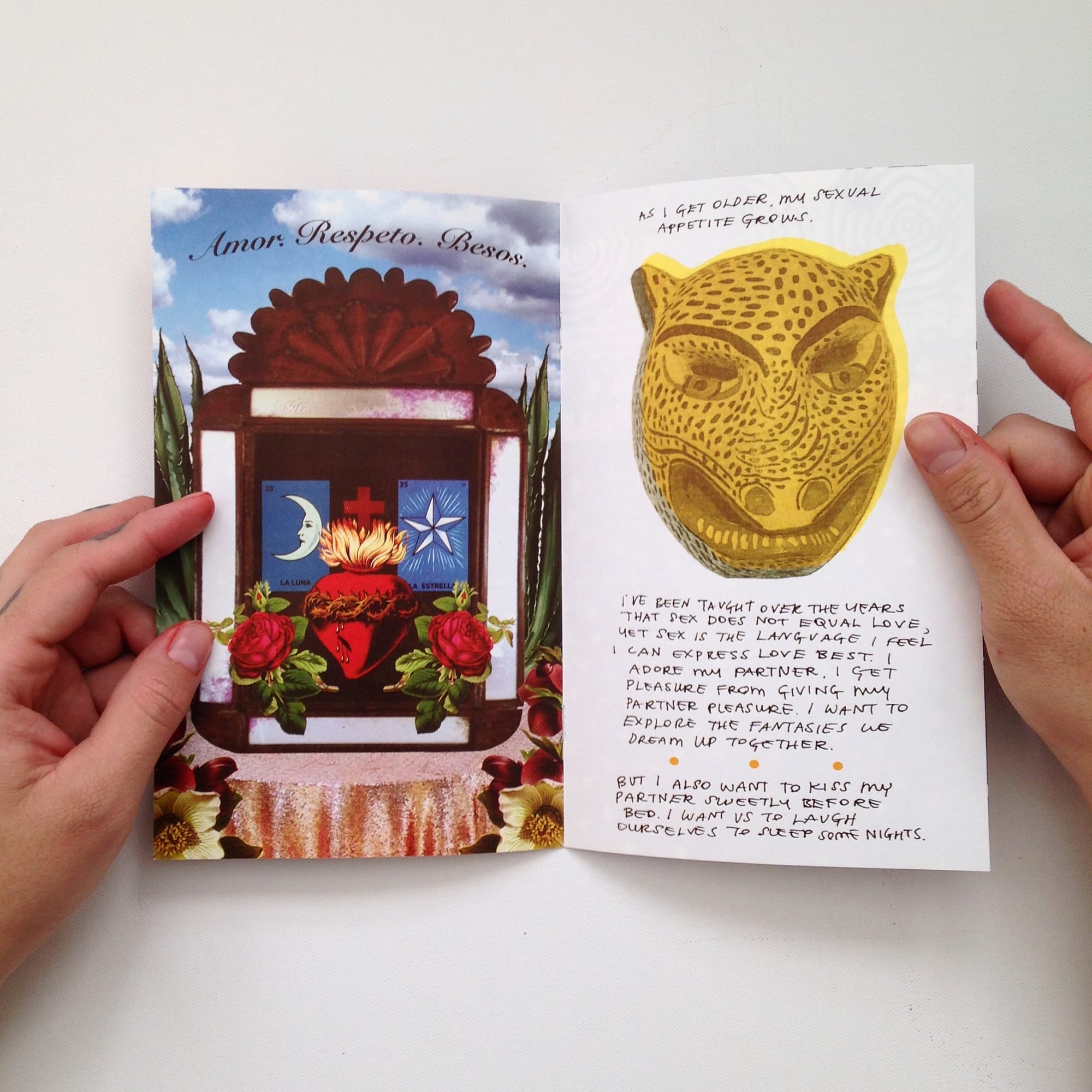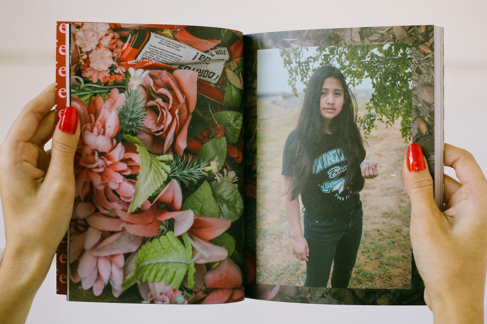 For a photography-led approach, see Homie House Press, a publishing press self-described as “a playground where fotos become books, a safe space for secret stories and an open house for honest content.” With an explicit emphasis on centering underrepresented voices, the publications are colorful, tender, critically engaged objects of reflection. A flip through Femme Frontera, for example, reveals intimate portraits layered on floral patterns and interspersed with personal narratives. The project, led by Adriana Monsalve and Arlene Mejorado, tells the stories of fronteras, or borders, both physical and metaphorical. Focusing on the California/Mexico and Texas/Mexico borders, they consider how these liminal spaces shape the immigrant experience. A rugged yellow line bisects one page; a poem hugs its contours: