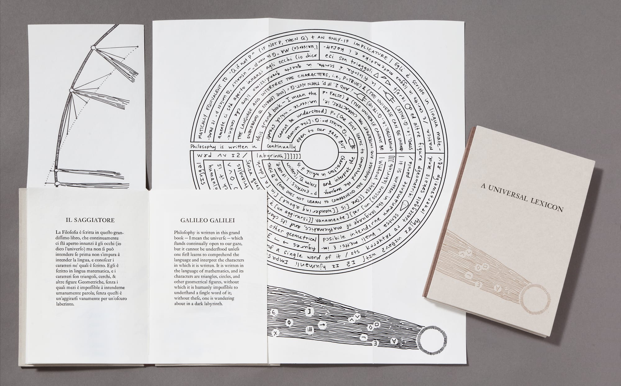 Take Sarah Hulsey’s books: precise, academic, letterpress-printed artifacts. Applying her background in linguistics to her art, she uses the book form to explore questions of language and logic. A Universal Lexicon, for example, centers on a passage from Galileo that begins: