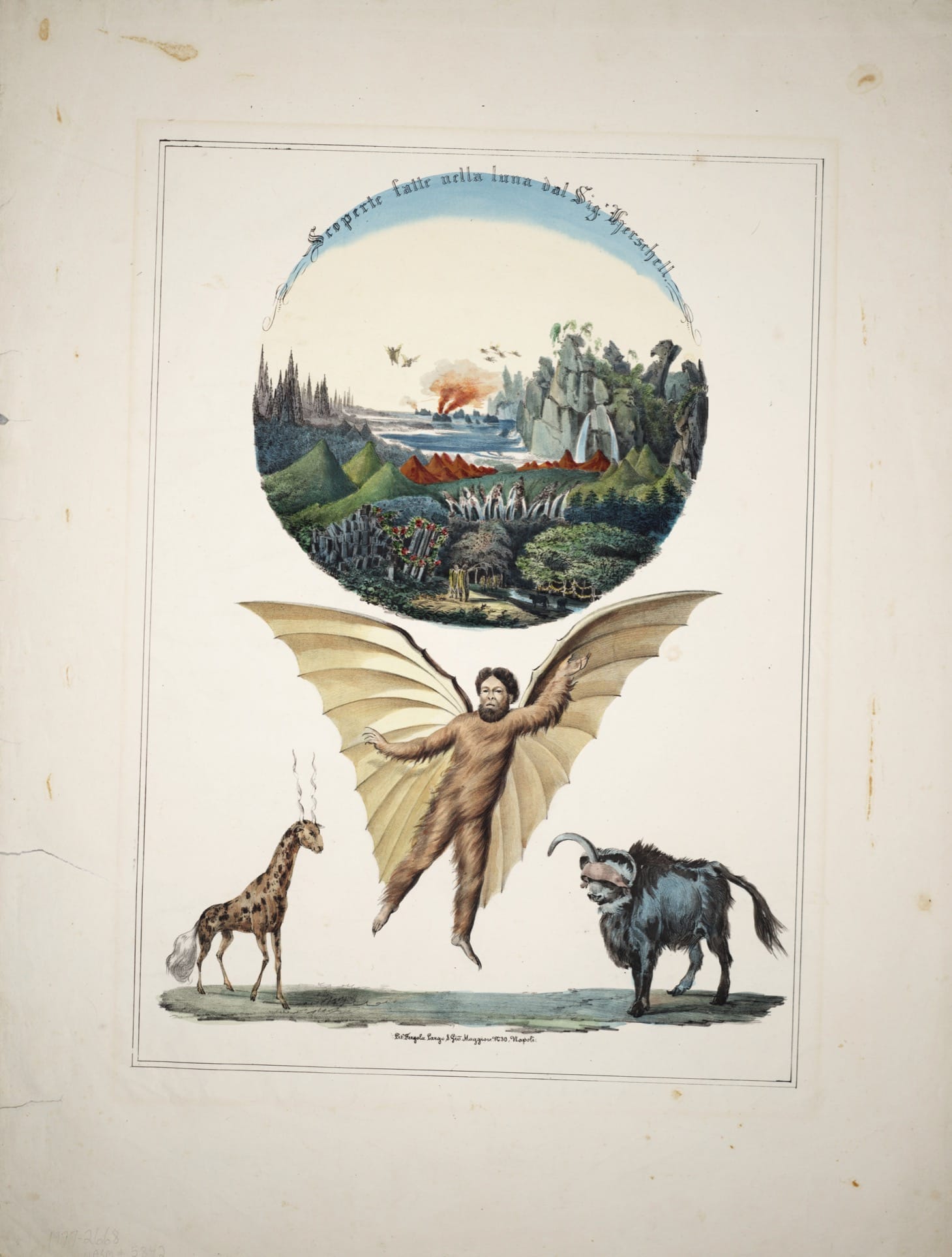 The difficulty of assimilating these images with an idea of the Moon founded only in its naked-eye visage would, I suspect, have been nearly impossible to transcend. This disconnect makes some sense of one of the exhibition’s quirkier offerings: an 1835 lithograph picturing the Moon’s surface as a place of dense forests and strange winged creatures, inspired by a series of articles in the New York Sun claiming astronomers had observed such things. The articles, which were a hoax, apparently convinced some segment of the paper’s readership — a credulousness that belies the sharp division the public was willing to entertain between the Moon as they had seen it and the Moon as astronomers (purportedly) did. To the unitary, mythic Moon had been added an astronomical counterpart. The Earth had, in the popular imagination, not one Moon but two.