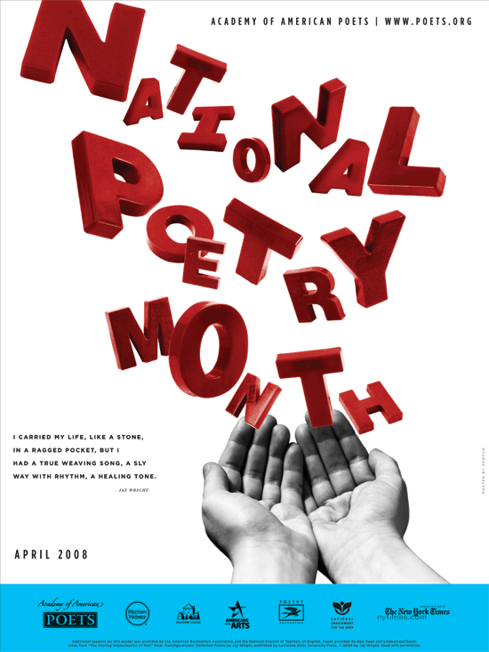 If you aren’t familiar, April was claimed as National Poetry Month in 1996, evidently by someone with appropriately literary sense of irony (“April is the cruelest month,” begins one of the most famous poems in the language). Three years later UNESCO declared March 21 to be World Poetry Day, a decision rumored to have been motivated by a desire to outmaneuver National Poetry Month — the idea being that if World Poetry Day falls on March 21 the American populace will be sufficiently versed-out once April rolls around. Not wanting to be embroiled in a poetic turf-war, the United Kingdom celebrates National Poetry Month as early (or, if you like, as late) as October.