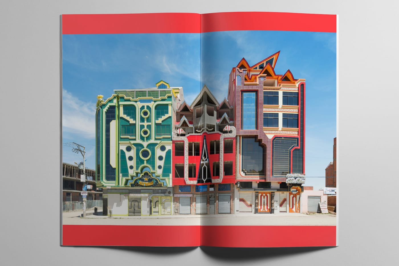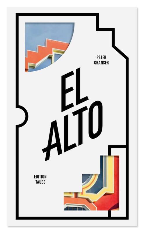 Last year, German photographer Peter Granser captured a selection of Mamani’s visual splendors in a format whose careful construction echoes the rigid and deliberate lines of the complexes. Originally commissioned by The New Yorker, his images now also appear in El Alto, a beautifully designed photobook recently published by Edition Taube. The tall, large-format title is slim as a pamphlet but bursts with dynamism: each page sets Mamani’s multi-hued buildings against brightly colored backgrounds that enhance the vibrancy of Granser’s images.