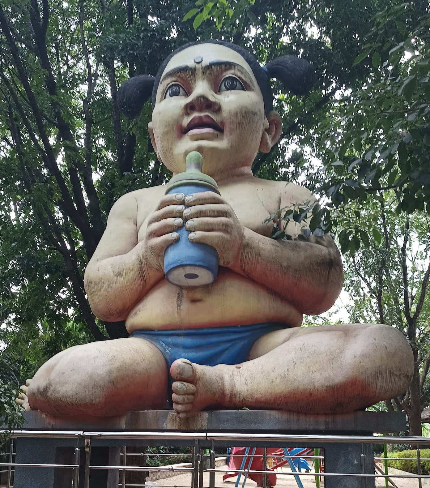 One unintentionally subversive statue, located in a park in south Bengaluru, depicts a 20-foot-tall baby, eyes wide open, sitting cross-legged, milk bottle in hand, and sporting an unnerving smile. This statue represents the presence of a children’s park, but it wouldn’t be out of place on the set of a kitschy Hollywood horror flick.