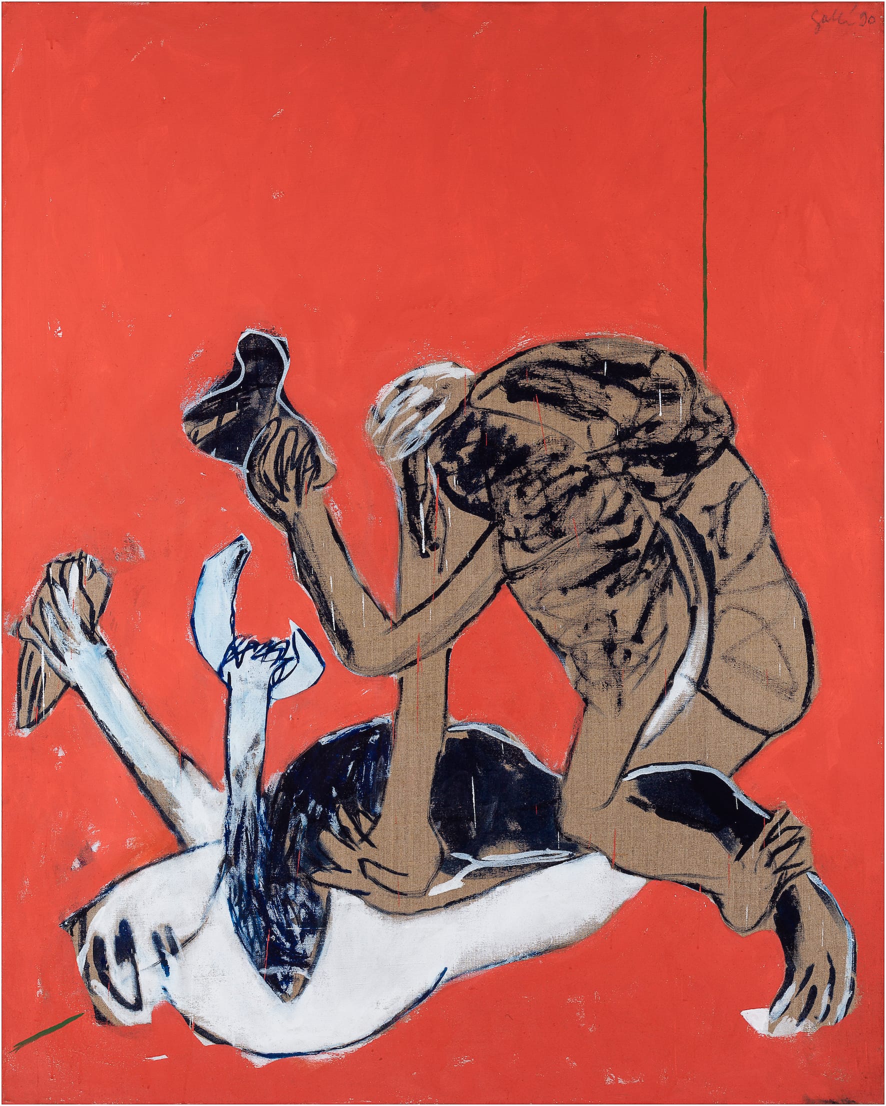 Many of the works are simultaneously violent and sensual, using a sparse but complex visual language that refuses to yield to the viewer’s analytic eye too easily. In “o.T., (750 Jahre Galerie Nothelfer)” (1988), for instance, deformed bodies appear to be dancing, perhaps in joy. One pair of short-fingered hands cradles a yellow heart while another brandishes a blue knife. Simple brushstrokes hint at orifices and sexualization, while the sparse application of primary colors is almost childish, suggesting an innocence belied by the potential of violence.