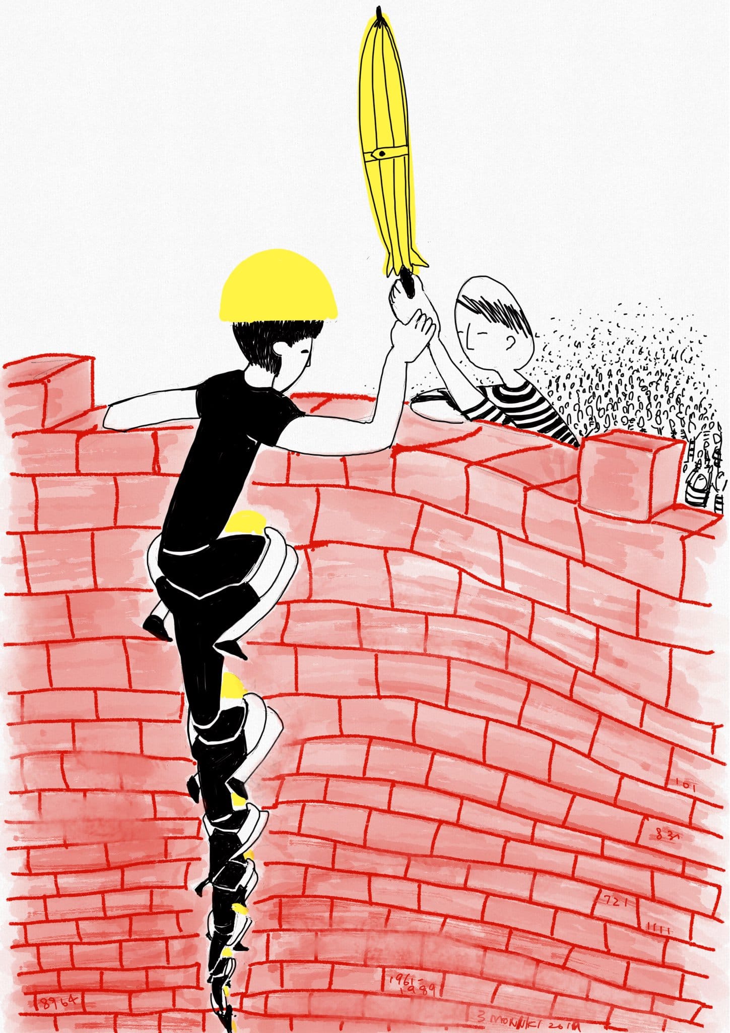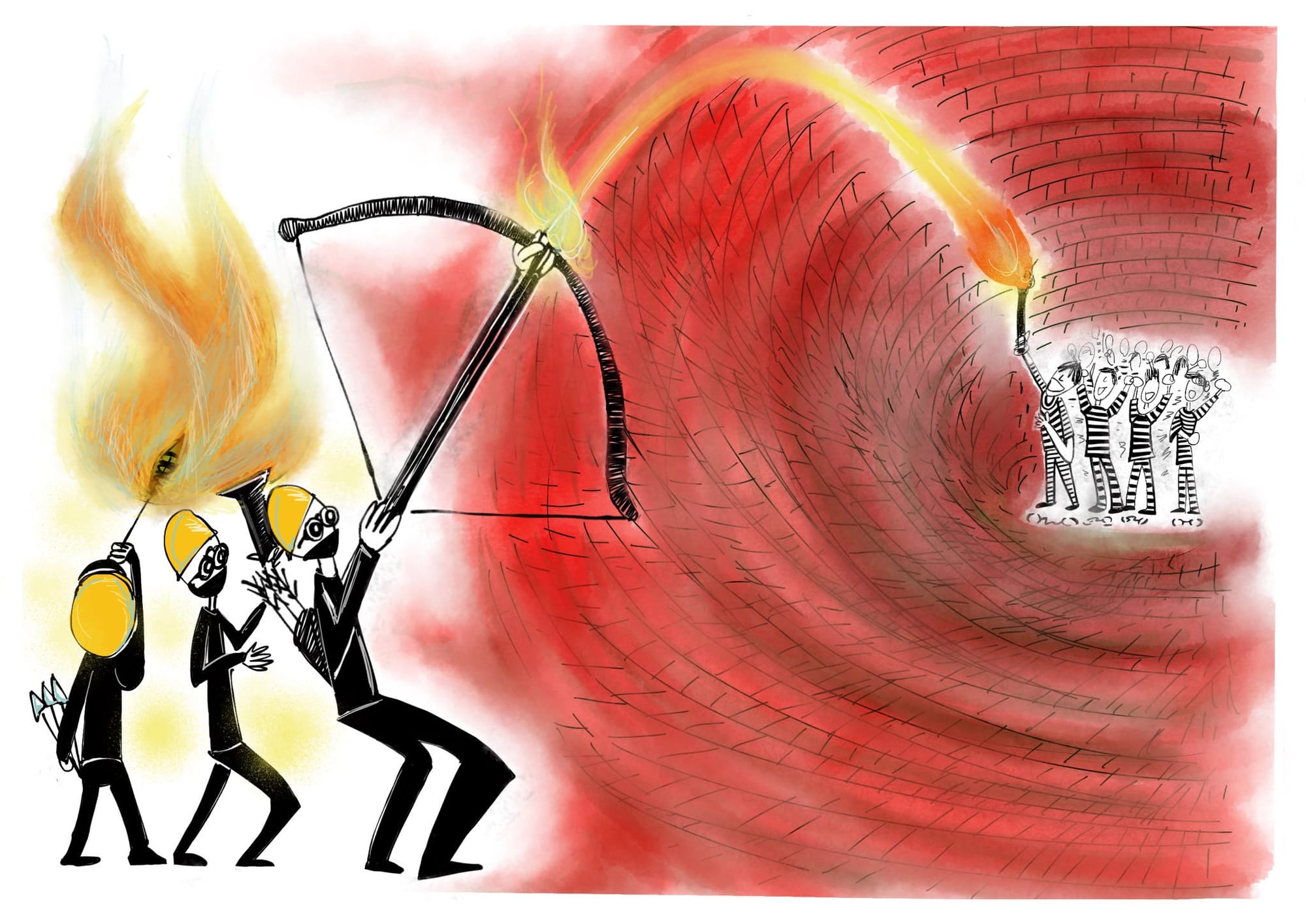 Hongkongers have developed innovative measures of self-defense, from bonfires to makeshift fortresses. University students build barricades guarded by archers and catapults. The artist Three Hands Monkey links these defenders with incarcerated activists in two striking illustrations. In one, an archer notches an arrow lit by torches from prisoners behind a brick wall. In another, hardhat protestors stand on each other’s shoulders to pass a yellow umbrella over a similar barrier. This is a reference to the 2014 Umbrella Movement, a similar wave of protests carried out by students in favor of more transparent elections. Then and now, umbrellas help defend against pepper spray and tear gas when police attempt to disperse crowds.