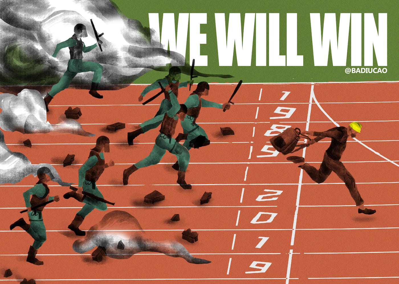The 2014 movement also saw the first appearance of “Lennon Walls,” pop-up displays of brightly colored sticky notes with anonymous messages. Chinese-Australian political cartoonist Badiucao recently designed a flag based on the concept — a checkerboard pattern in shades of yellow, orange and pink. In a recent work, he appropriates “Raising the Flag on Iwo Jima” by placing yellow hardhats on the men and replacing the flag with his design. He sets the scene atop a prone Winnie the Pooh (an icon banned on social media in China, allegedly due to critics comically comparing President Xi Jinping to the cartoon character). Badiucao also spreads a message of victory in similar installations around the world. His “We Will Win” poster shows a lone civilian in a hardhat racing on a track against flailing cops. This design currently appears on Lennon Walls at the Berlin Wall Memorial and in Sydney.