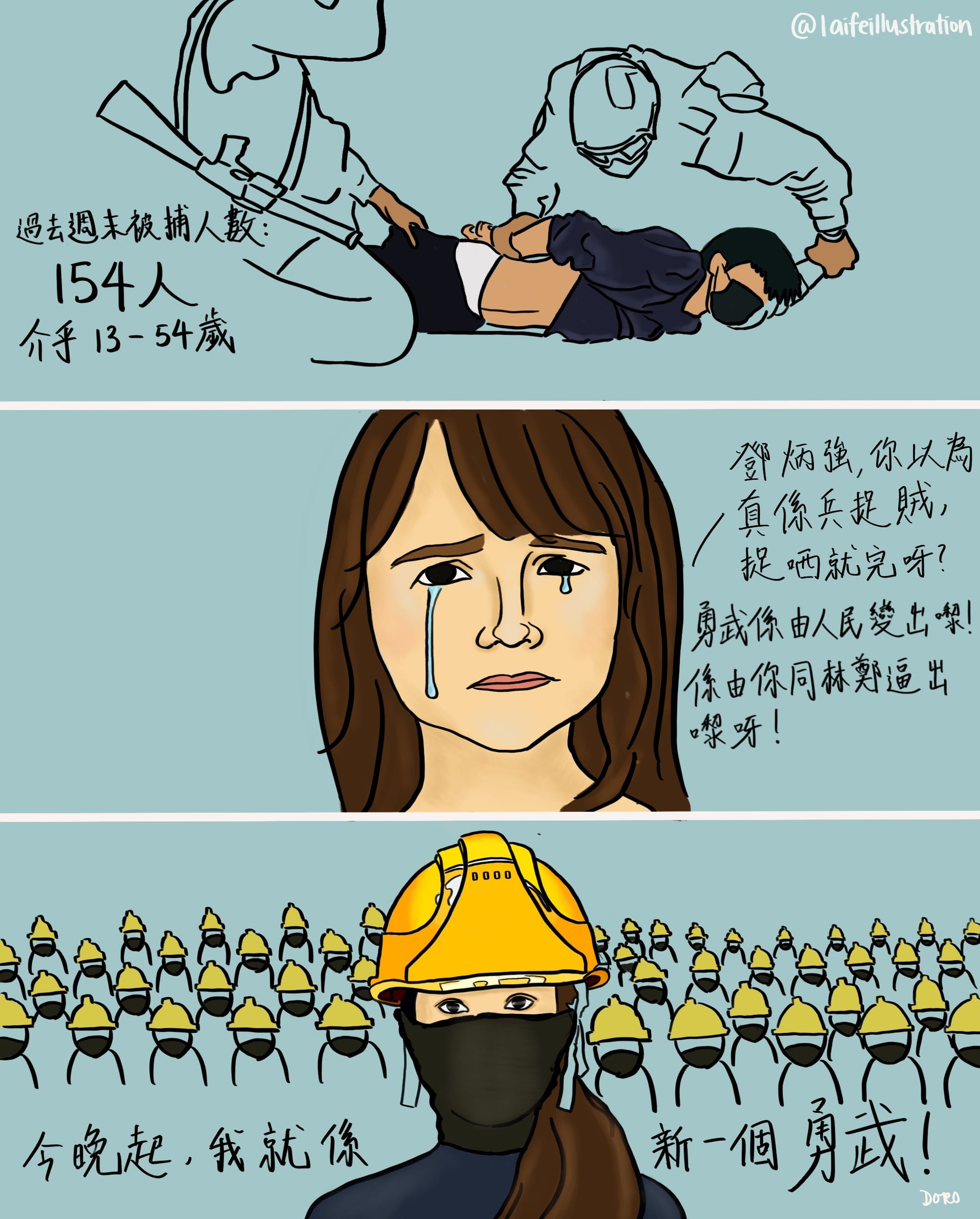 Newly empowered by electoral success, demonstrations now stretch for miles. Police push back with brute force, throwing tear gas canisters and shooting rubber bullets. Officers seriously injure anyone they label as “rioters” and arrest them for decades-long sentences — a residual statute from the British colonial era. As tensions increase, artists actualize these confrontations for audiences worldwide. An illustration that circulated on Telegram even maps out 45 specific incidents since June.