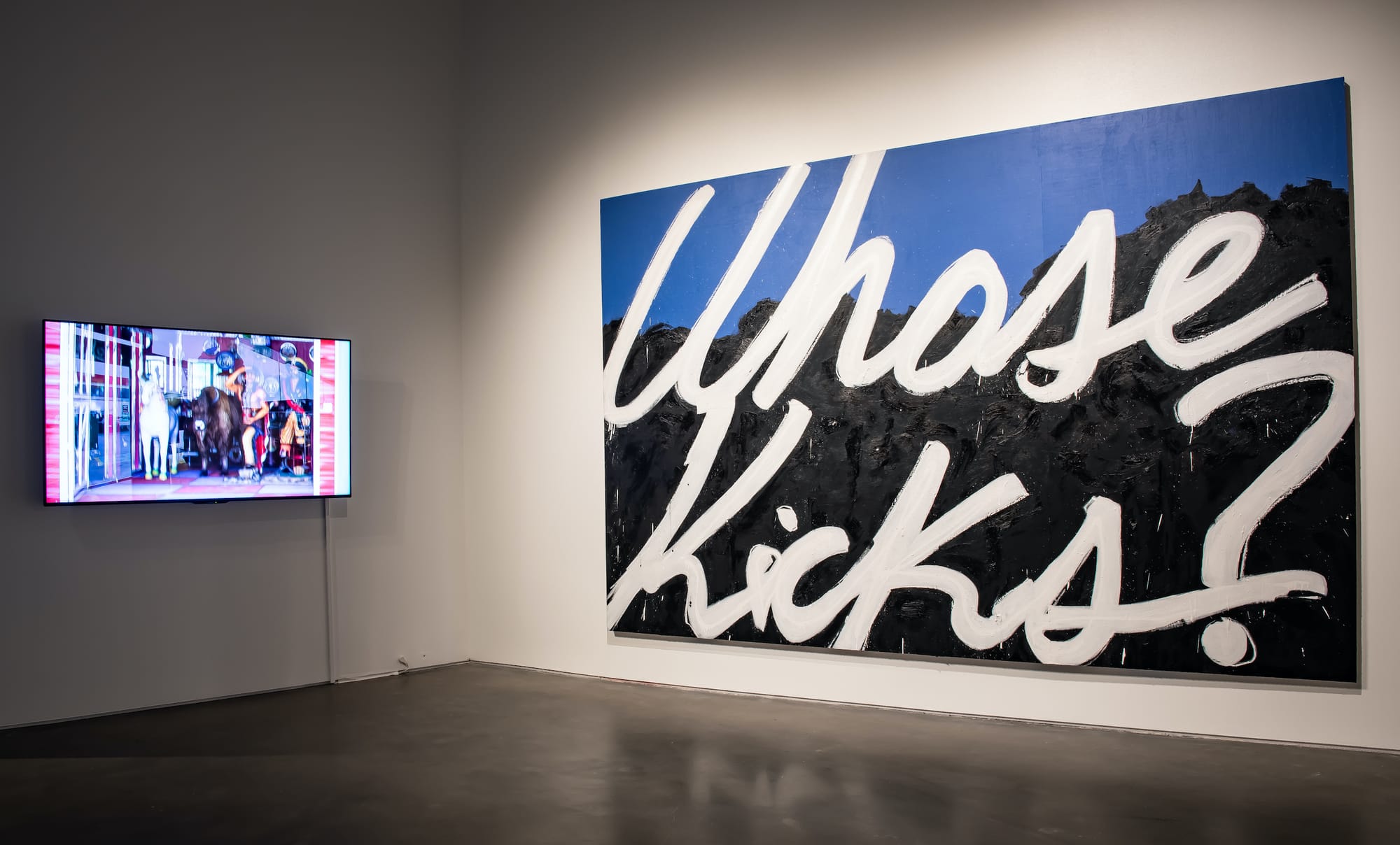 The land is also a palpable presence in Ruth Borum-Loveland's series Soil Studies, which resonates with Harjo’s verse: “You will see red cliffs. They are the heart, contained the ladder.” Borum-Loveland created grid paintings in brown tones with tempera made from soil and rocks she’s collected. Natural pigments derived from the Oklahoma land also appear in Yatika Starr Fields’s (Osage/Cherokee/Muscogee) large canvas, bearing the phrase “Whose Kicks?” The artist made the white pigment with crushed mussel shells found in rivers and lakes and named after Wilma Pearl Mankiller, the first female Principal Chief of the Cherokee Nation. Fields’s work is a critical response to pop culture representations of the iconic Route 66, which passes through the land of more than 25 tribal nations, from the song “(Get Your Kicks On) Route 66” to the work of artist Ed Ruscha (who had a large retrospective at OK Contemporary in 2021).