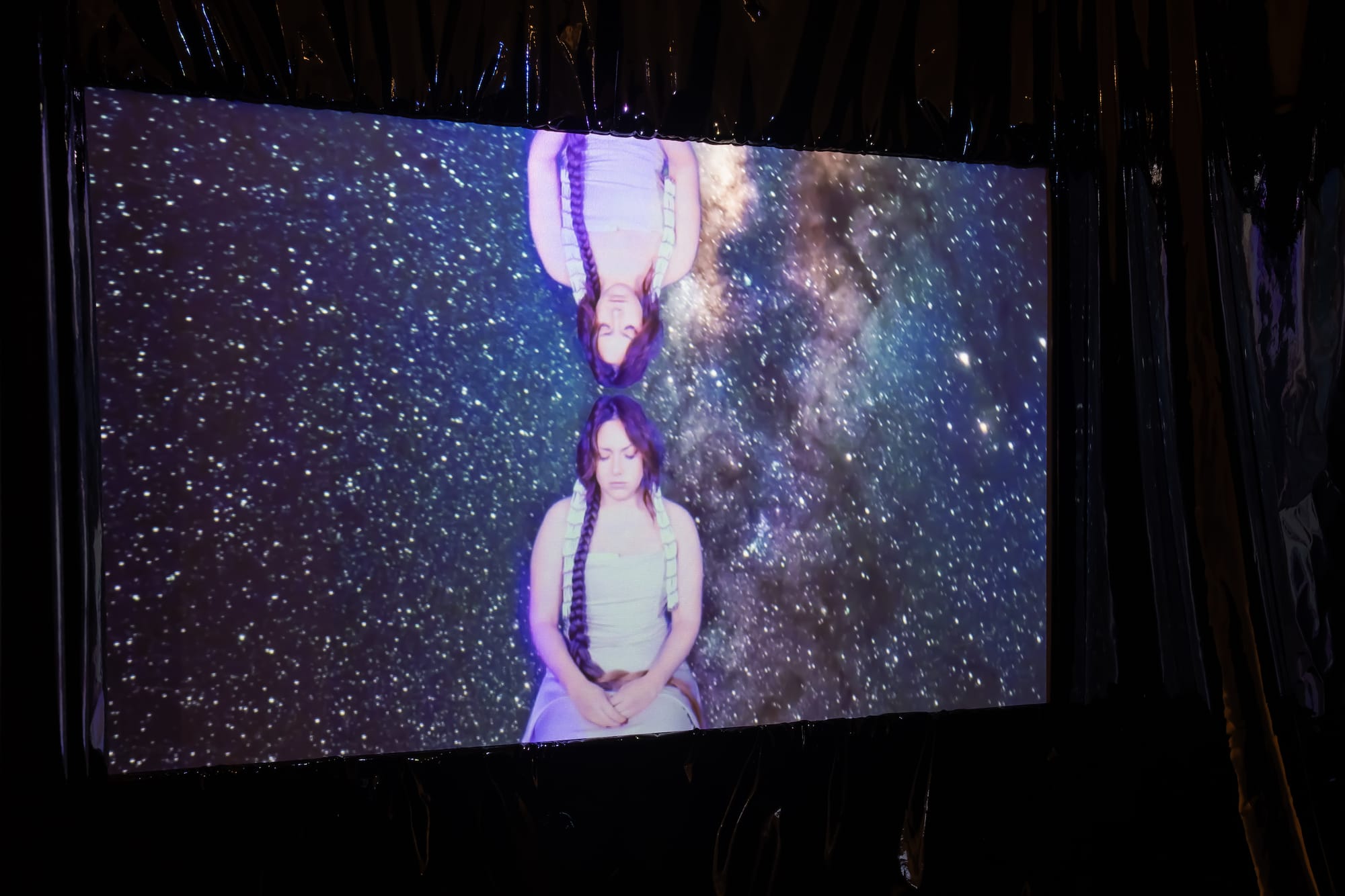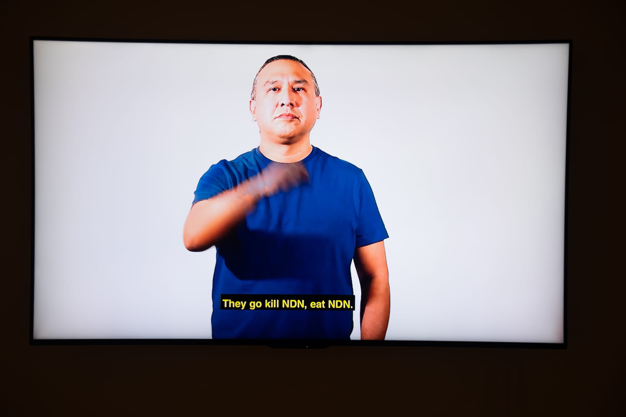 The first work viewers encounter in the exhibition is a video, "A Map to the Next World” (2023), by filmmaker Sterlin Harjo (Seminole Nation of Oklahoma/Muscogee), best known for his television series Reservation Dogs. Reflecting on the land, the filmmaker recorded Joy Harjo (no relation) walking on her property while reading part of her poem. It is the first time he produced a film to exhibit in a contemporary art museum setting since, as he told me, "museums are the place where Indians go to die.”