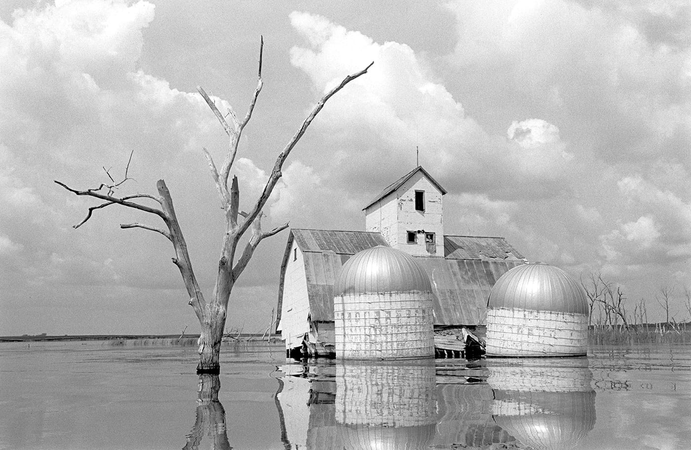 In fact, for just over a decade, in annual, late-summer, month-long road trips through the area’s broad threshold — the Plains States — Kayafas has produced almost 20,000 images of rodeo riders, cheerleaders, crop fields, and farm buildings standing lonely in the landscape or half hidden by floodwater. Now, 74 of these emblematic black-and-white photographs have been judiciously selected and sequenced in his latest book, The Way West (Purple Martin Press, 2020).