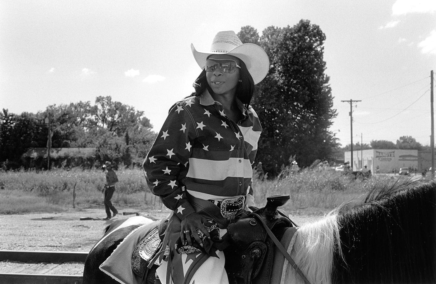 Elsewhere, in a departure from his photos of mostly white spectators and rodeo participants, “Okmulgee, Oklahoma, 2015,” one of The Way West’s most striking images, shows a young black woman in a straw cowboy hat, large sunglasses, and a crisp, American-flag-printed shirt, sitting confidently in the saddle, looking off to her right and delivering some unexpected, high-charged fabulousness to a corner of the outback somewhere south of Tulsa.
