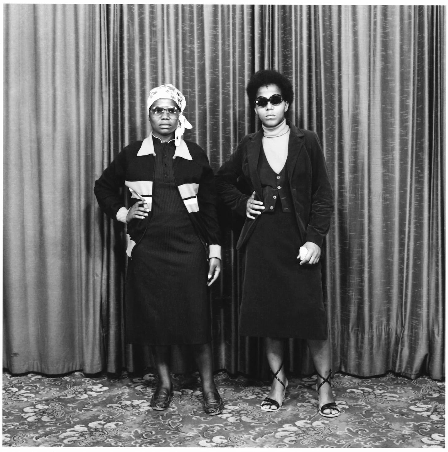 If the first third of the exhibit is about reductive ways of being seen, the rest of the exhibit expands the sitters’ gaze to extend in both directions. Images like S.J. Moodley’s “Two women wearing Western attire” from 1981, and Lolo Veleko’s “Girl in yellow” from 2003 are emblematic of this dynamic. Both are head-to-toe framings of their subjects that evoke a sense of performance. The individual styles of both subjects invite us to see them on their own terms as they consciously project confidence and self-definition.