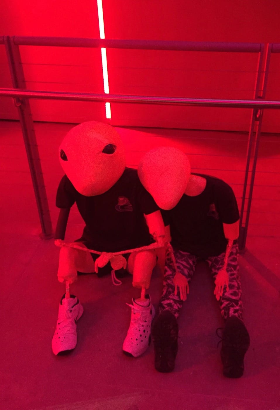 The next week I revisited the piece, wanting to think through my initial, opening night dismay. On a second viewing, and with less of a crowd crush, the sculptures’ balletic relationship with, and dialectic struggle against, each other became more apparent. Now it seemed to me that each of Kurian’s sculptures was linked to the next, in a chain of sincerity and irony, within that stairwell. The characters included figures that resembled frogs, pit bulls, a chromed chameleon, a she wolf, the “all holes” woman, and a giant baby. Halfway to the apex were two moon men in a death spiral — these were “Satters and Pulley,” names borrowed and modified from Wyndham Lewis’ modernist, and reactionary, novel Childermass (1928). The upper figure was in the motion of delivering a lethal kick to the lower one’s blown glass face. On the back of the victor was an American flag with Arabic stencil and the words “Never Forget. September 11th.” That last motif hints at Kurian’s appropriation of the Childermass title as an ironic nod to the interwar fascist ideology Wyndham Lewis held — perhaps, like many others, he sees a revival of this ideology now.