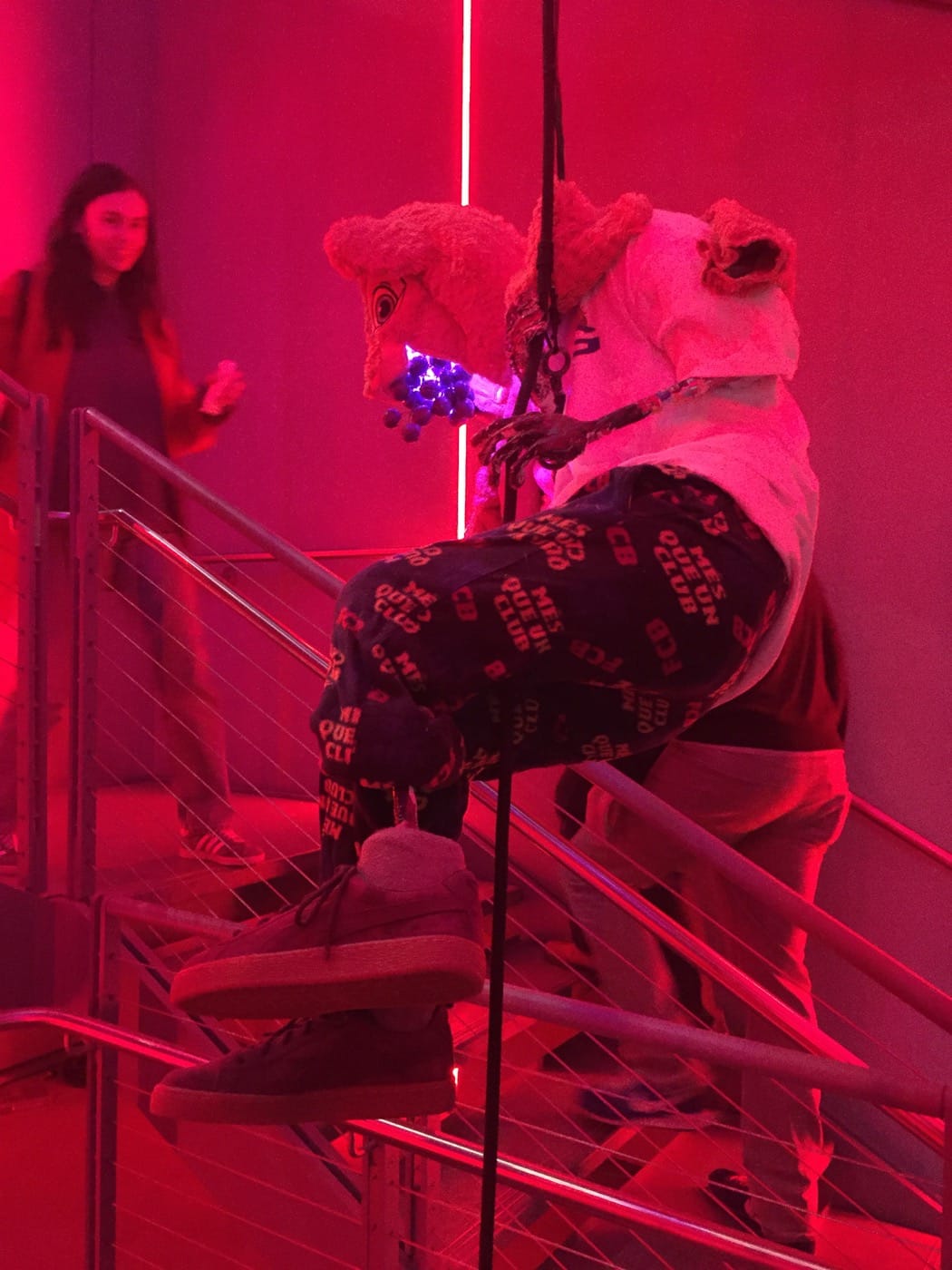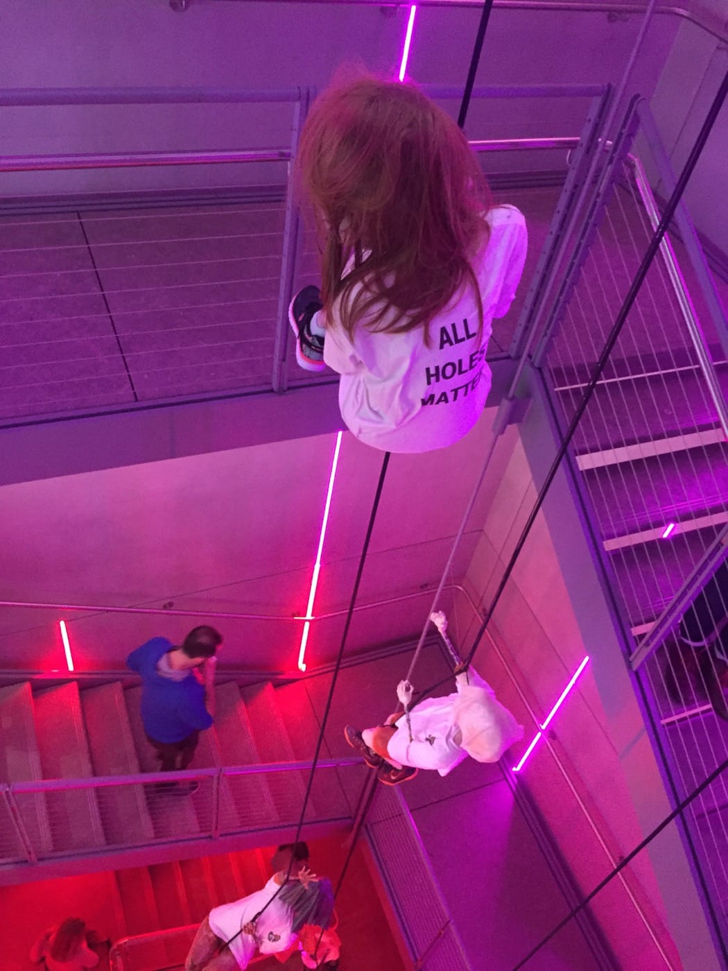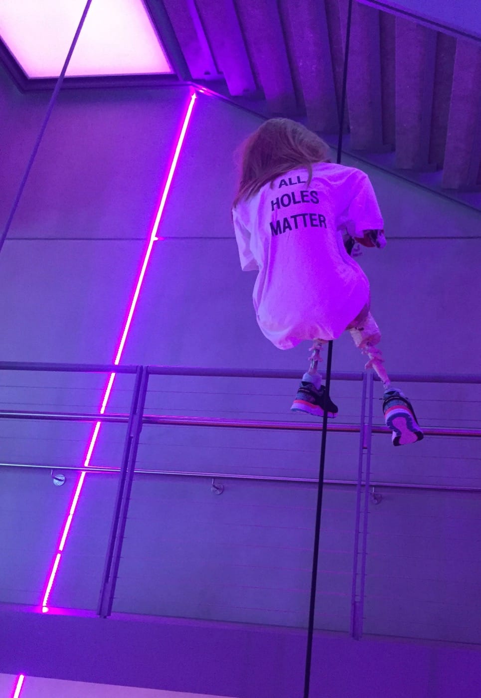 Lacking contextual aids, I took in Kurian’s sculpted welded steel figures and remained stuck on one piece — a woman wearing a t-shirt reading “All Holes Matter,” climbing up a set of ropes that connects the figures. Maybe the slogan is a humorous provocation, but that night I could not take it lightly. In last year’s cultural semantic wars, “All Lives Matter” was a circuit jam, seemingly channeling Rodney King’s “can’t we all get along” into a call for race-blind humanity, but actually delegitimizing the unique violence experienced by black and brown bodies in America. Hearing giggles from young men behind me, as they spotted this t-shirt, opened another possibility: that audiences were zeroing in on the potential of having sexual carte blanche. “Lives” might become “Loves,” but I worried about the signifiers of group violence associated in pornography.