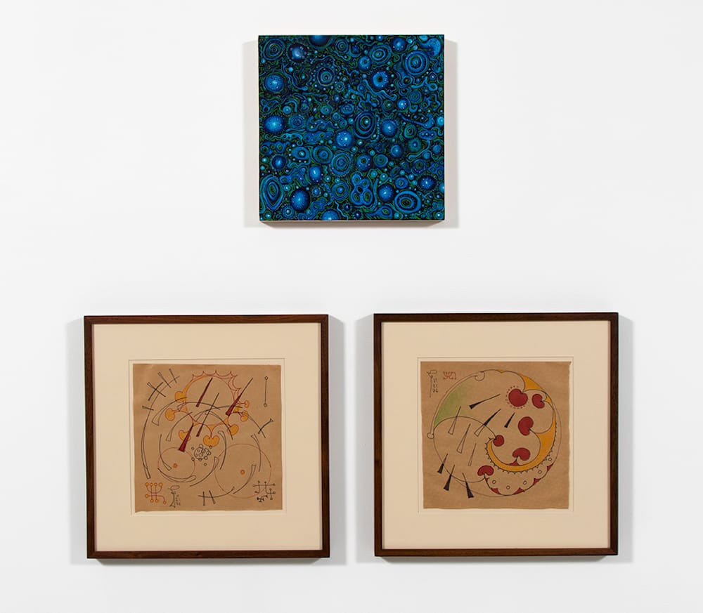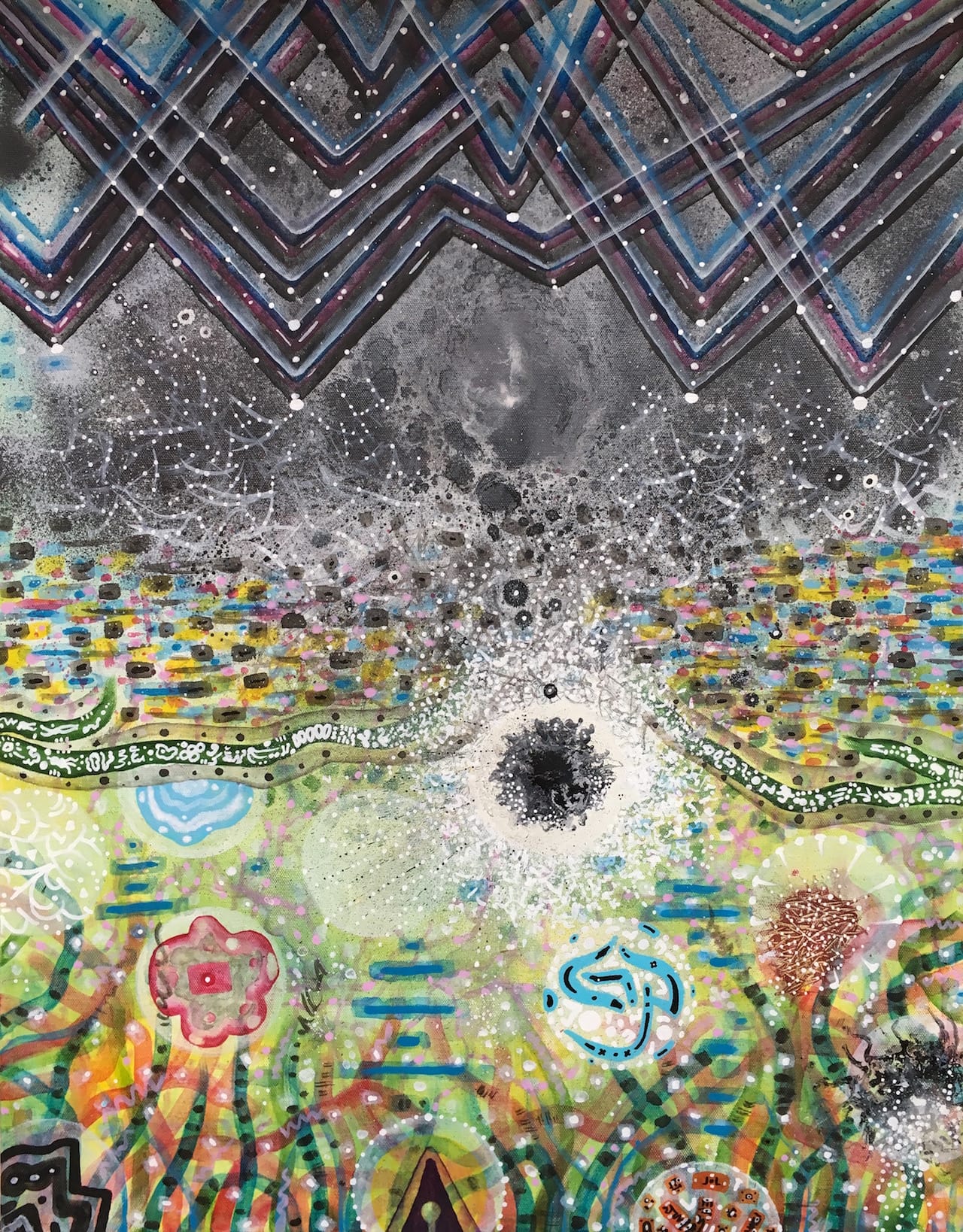 From its origins at the turn of the twentieth century, abstract art has looked to the cosmos as a paradigm for a new sense of space. As our knowledge of the cosmos has grown, artists have continued to respond to the increasingly complex information scientists posit, as well as the expanded vision found in telescopic and satellite images. Many of the artists in this show have updated the original tenets of Non-Objectivism to include their experiences of mysticism, yoga, meditation, and psychedelics. In many instances it seems the further out we gaze, the further inward we see, and the play of macro/micro space becomes another topic for reflection.
