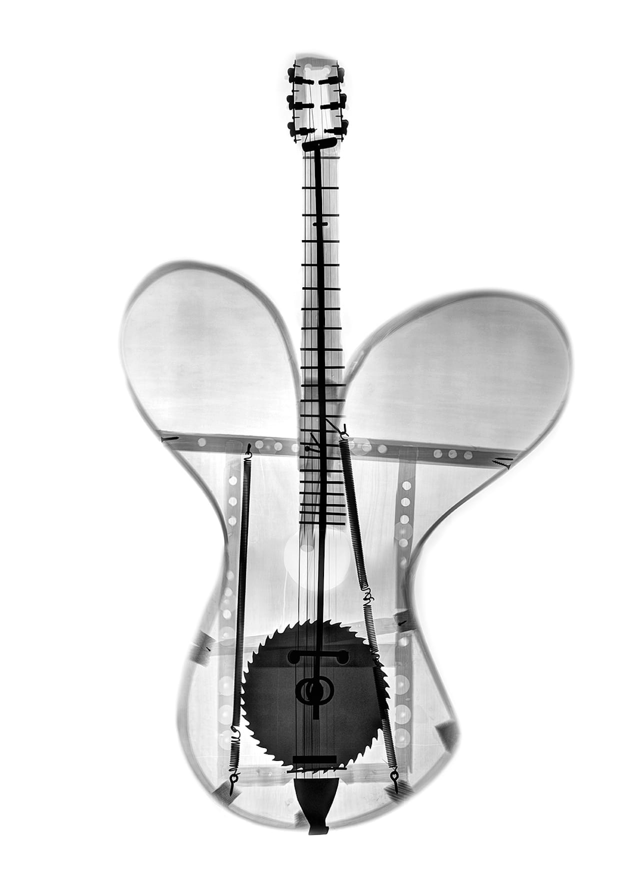 When he was six, during the height of the Great Depression, Stilley’s father left him, along with his mother and six siblings, giving them a brutal farewell: “You can just root, hog, or die“ (an old idiom about self-reliance). The resourcefulness Stilley was forced to learn shines in his cobbled-together guitars. In X-rays of these instruments, Hawley reveals their intricate inner workings: internal reverb systems made from screen door springs; pot lids and valve springs attached to metal truss rods, making for wild, oscillating tonalities. Stilley made the instruments from thick slabs of hard wood not usually used for string instruments and sawed them into strange, jagged shapes like butterfly wings and lopsided trapezoids.