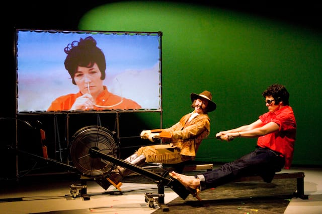 Also in Under the Radar, but rather more in the art performance realm, was A (Radically Condensed and Expanded) Supposedly Fun Thing I’ll Never Do Again – After David Foster Wallace. In director Daniel Fish’s choral recitation, four actors were fed lines via earphones, through which played David Foster Wallace reading from his work. The actors took turns relaying Wallace’s words, with varying degrees of success. Perhaps because of the headphones they wore, the actors often failed to gauge how well their voices carried into the audience. The whole production successfully favored the comic form of a sporting event, highly unusual in such a literary theatrical setting; the actors raced to catch up with Wallace’s galloping prose and, presumably, his unstoppable recorded voice. The stage was bare, except for countless tennis balls, which a machine had been launching at the upstage wall while the audience members took their seats. The tennis balls referred to one portion of the text, an extended meditation on the determinedly mediocre and spectacularly uninsightful memoir of a forgettable tennis champion, performed heroically by Therese Plaehn, who managed to calmly recite the text while doing jumping jacks.