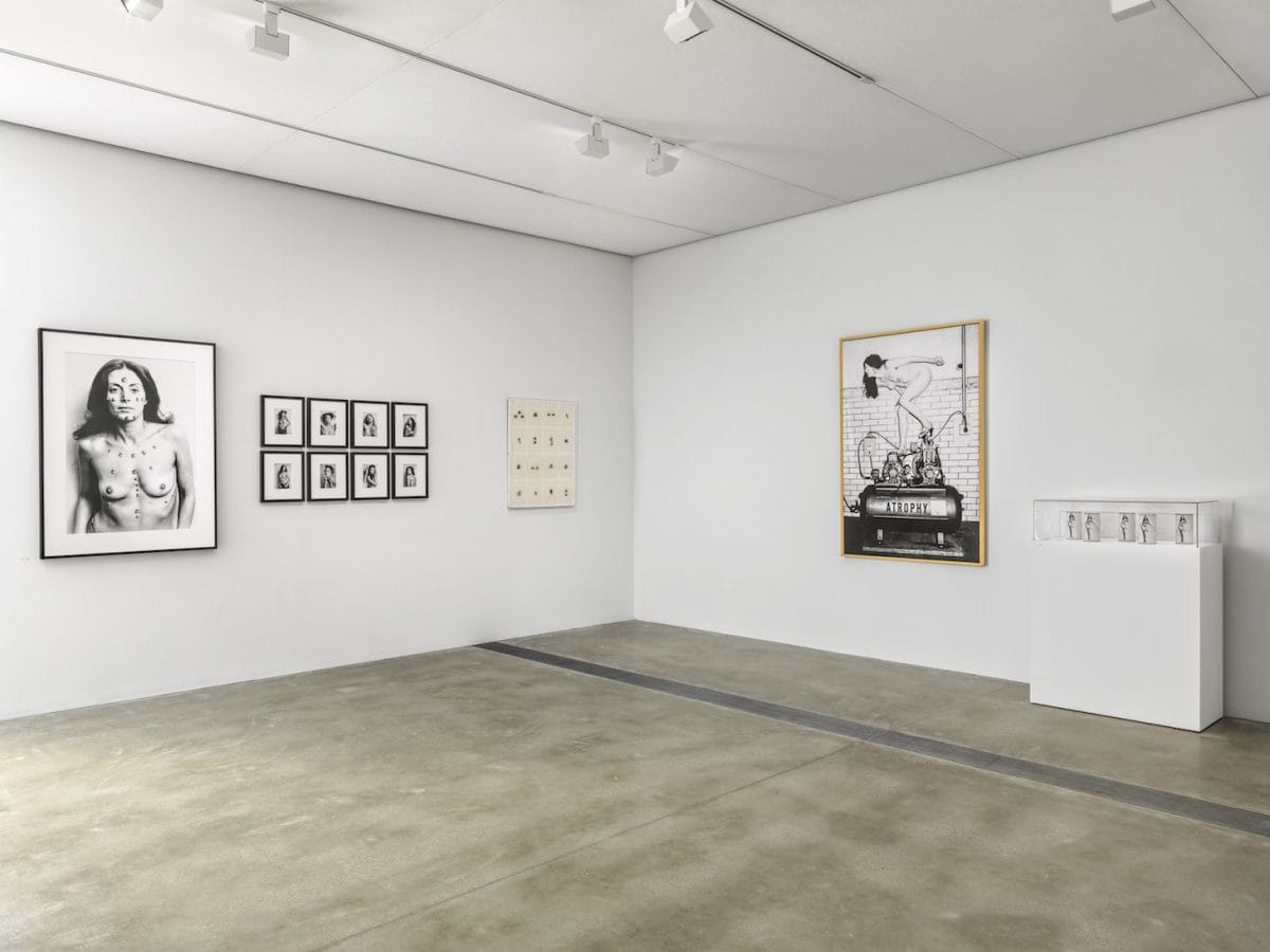 On the opposite walls, nine gelatin silver prints from Wilke’s S.O.S Starification Object Series depict the artist in varying states of undress, parodying tired depictions of women common to mass culture. In one huge “performalist self-portrait,” as she called it, titled “Atrophy,” a naked Wilke balances in high heels on the precarious surface of an air compressor, presenting herself as “a trophy,” in her objectified state, and a pun on the diminishment of women only valued as such. In an age in which the clever selfie is utterly banal, it is easy to forget the radical nature of Wilke’s playful interrogations into the commodification of female bodies — claiming her own as both medium and agent of mindful transformation.