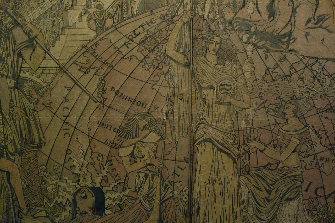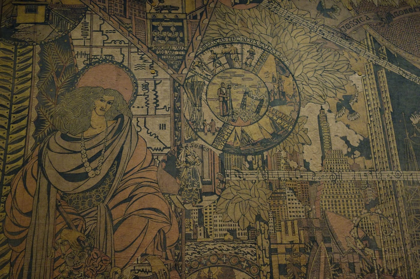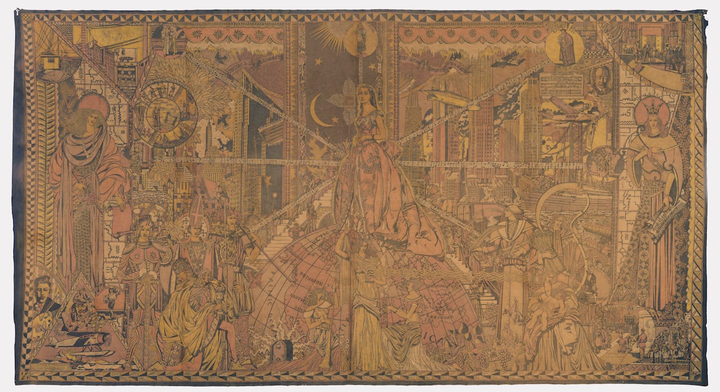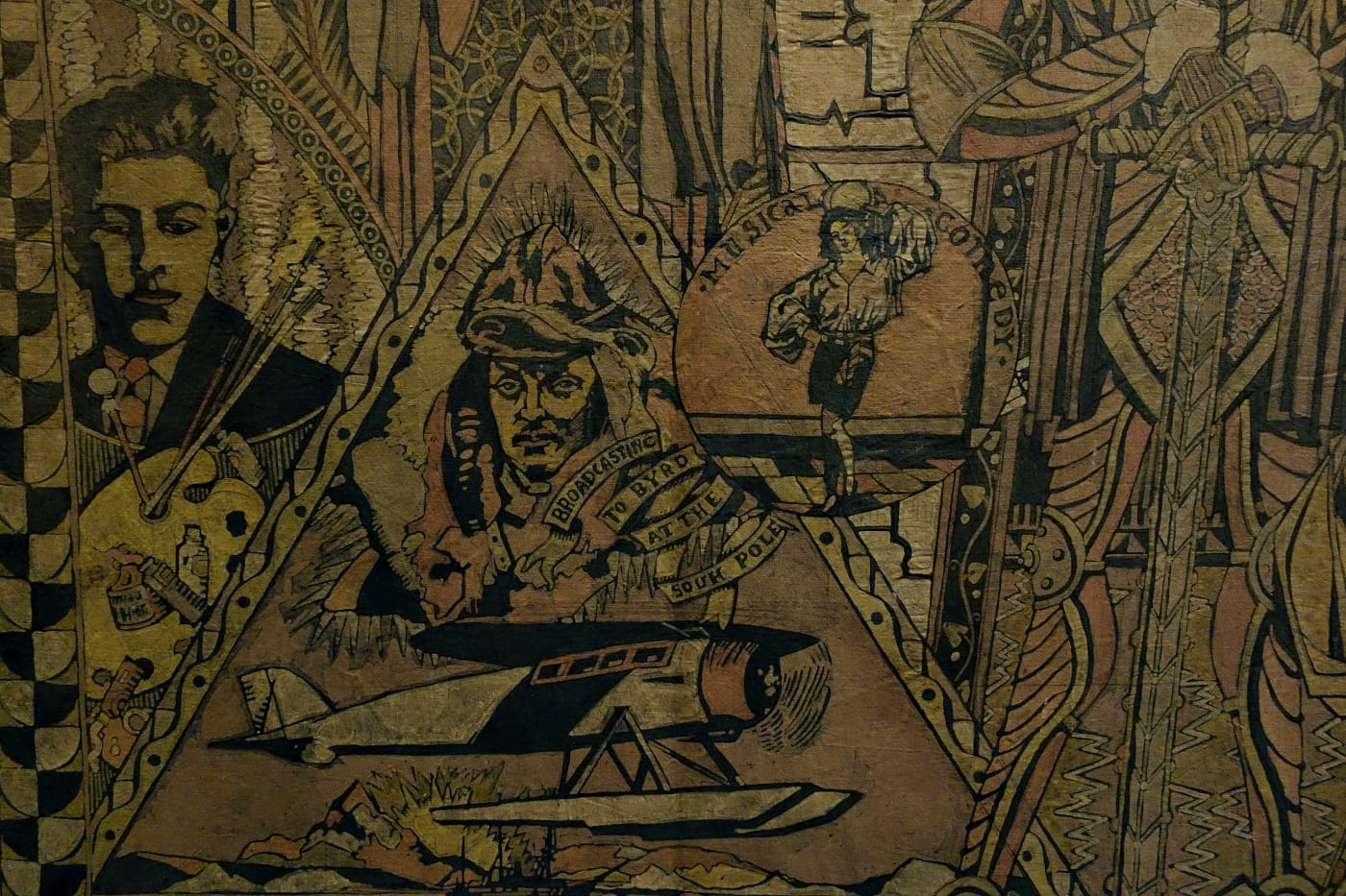 On display for the first time since 1978, “The World of Radio” mural at the Cooper Hewitt, Smithsonian Design Museum, captures 16 feet of radio history, as seen in 1934. When artist Arthur Gordon Smith created the cotton batik work, the medium of communication was still young: Guglielmo Marconi had patented his wireless telegraphy system 38 years earlier. The mural is dense with skyscrapers, steamships, zeppelins, and allegorical figures. It features Richard E. Byrd, who broadcasted from the South Pole; a T-type antenna; and Westinghouse Electric Company’s first radio transmitting station in Pittsburgh. At the center, surrounded by radiating lines of musical notes, a woman in a gown stands on the Earth, preparing to sing into an NBC microphone. She is Jessica Dragonette, a soprano whose performances were heard by millions of Americans in the early days of broadcast, earning her the title “Princess of Song.”