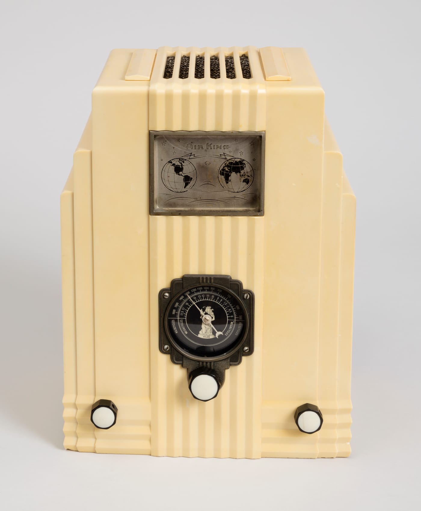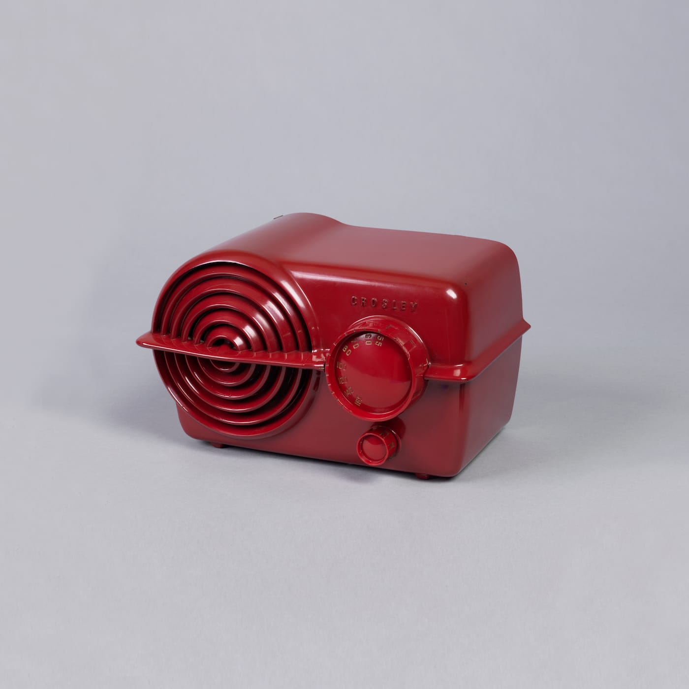 When Dragonette debuted on NBC in 1927, some well-heeled listeners may have heard her voice in their specially devoted radio rooms, like the one shown in a 1927 photograph of pianist Adèle Reifenberg’s apartment. As the decades went on, radios became more compact and affordable, and the examples in The World of Radio go up to the 21st century, such as the 2008 Etón FR 600, intended for emergency use or radio access without power. While that need for connection links all the models, there are aesthetic trends that signal different eras: The 1935 Skyscraper Radio, designed by Harold L. van Doren and John Gordon, has compression-molded plastic angular architecture; the 1950s Crosely radios have speakers that reference the shapes of curvy automobile grilles; and the 1961 Tischsuper RT 20, designed by Dieter Rams, has a minimalist style and a boxy shape combining metal, wood, and plastic.