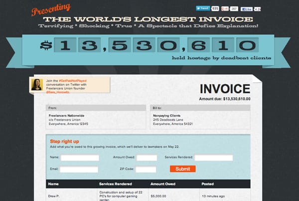 The Invoice has a simple premise: gather data on services rendered and amount owed. DeskMag says their goal is to reach document $1 million in unpaid invoices, but the site has already shot past a staggering $7 million. Ultimately, the invoice will be used to advocate for change: