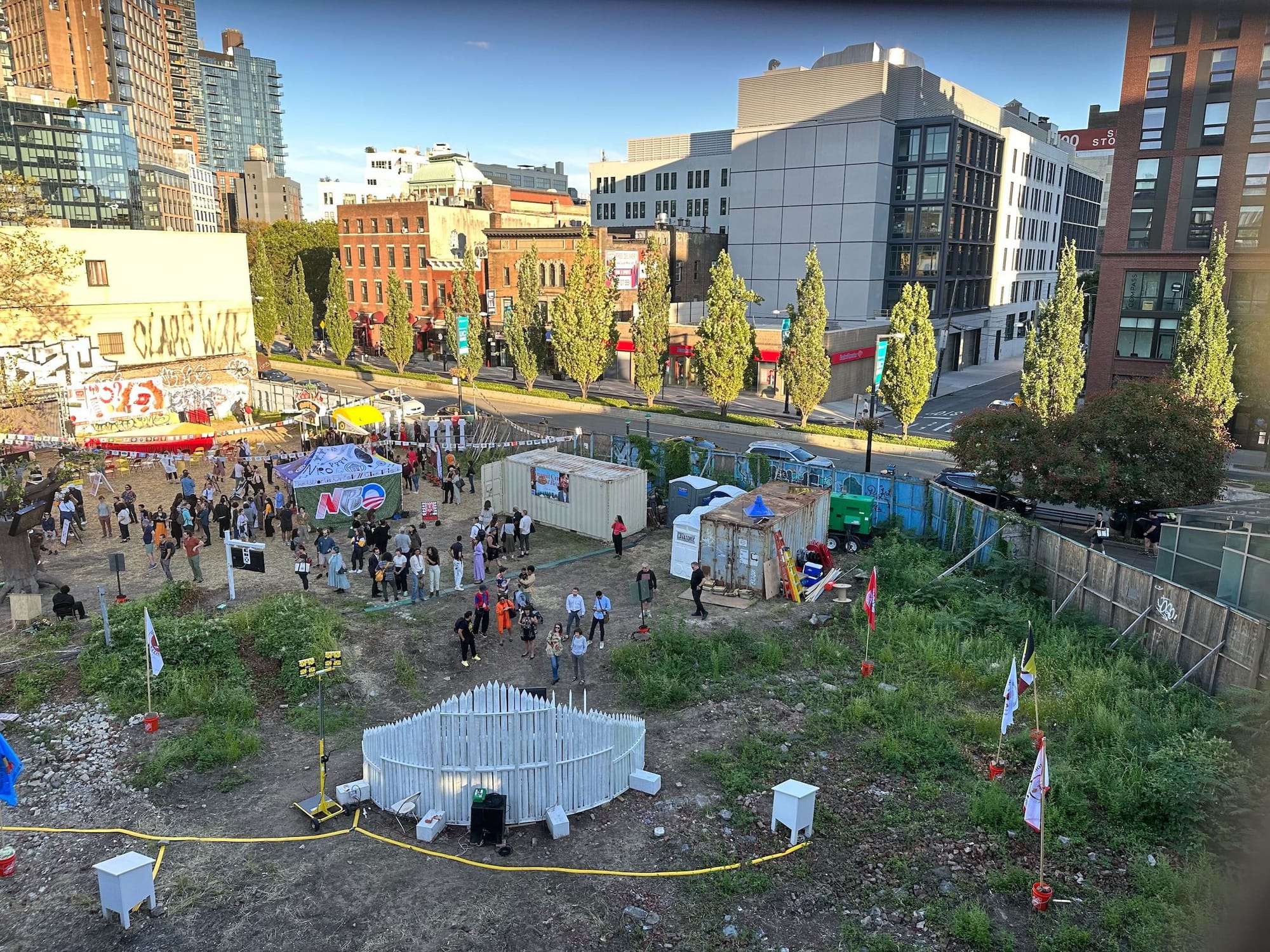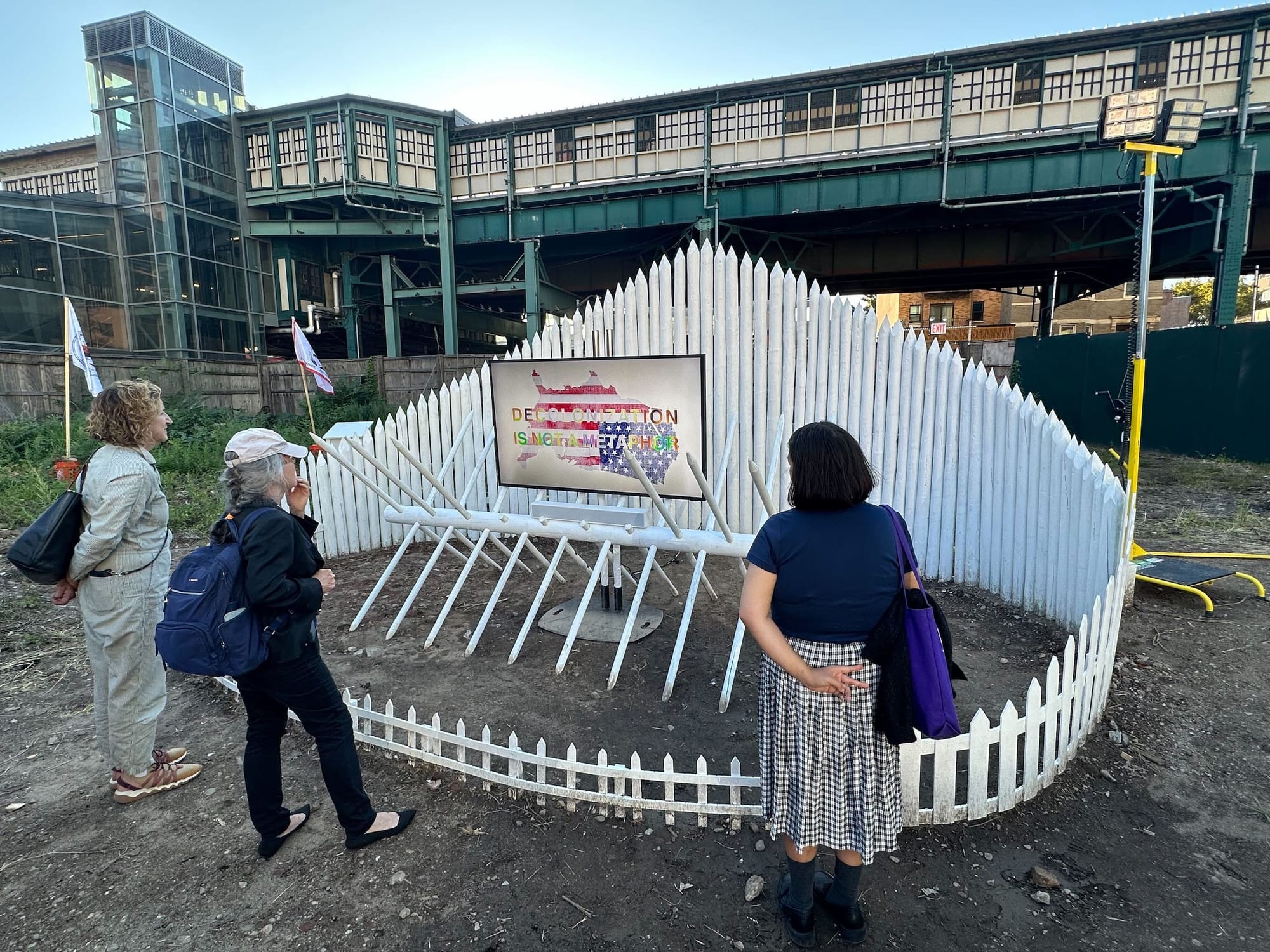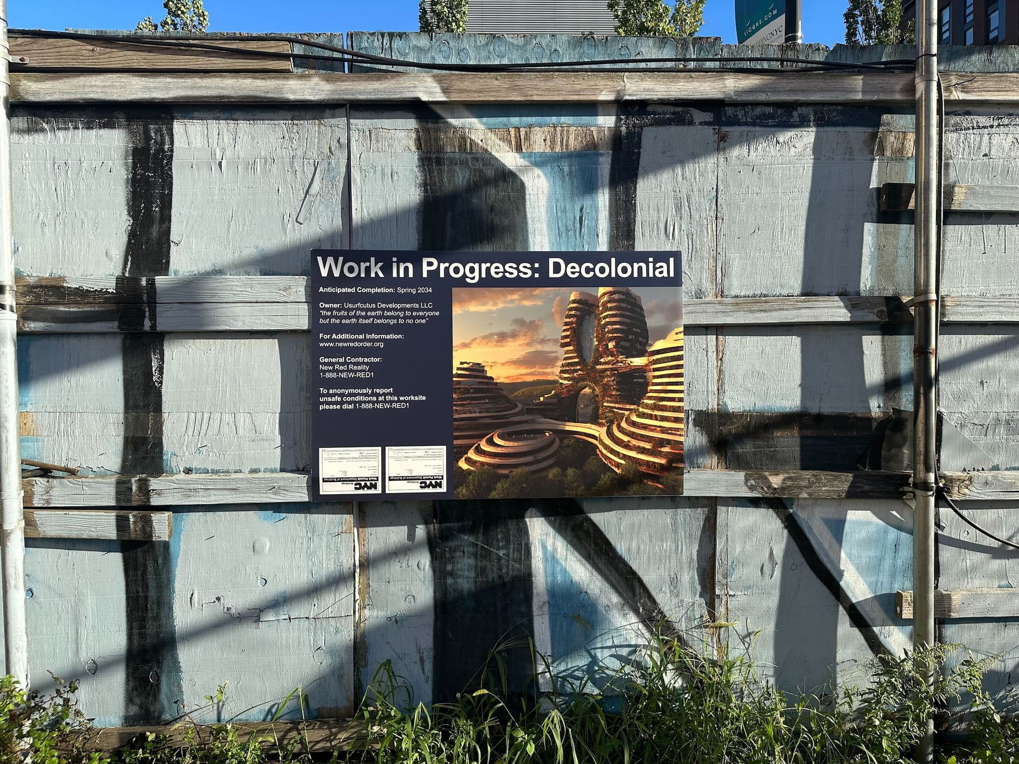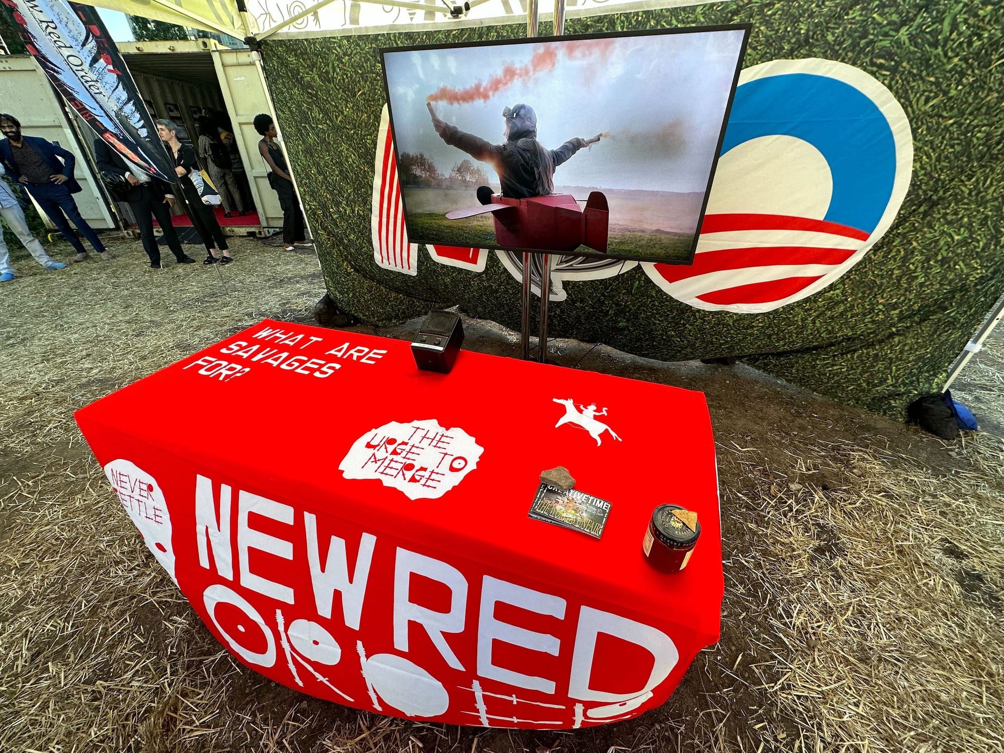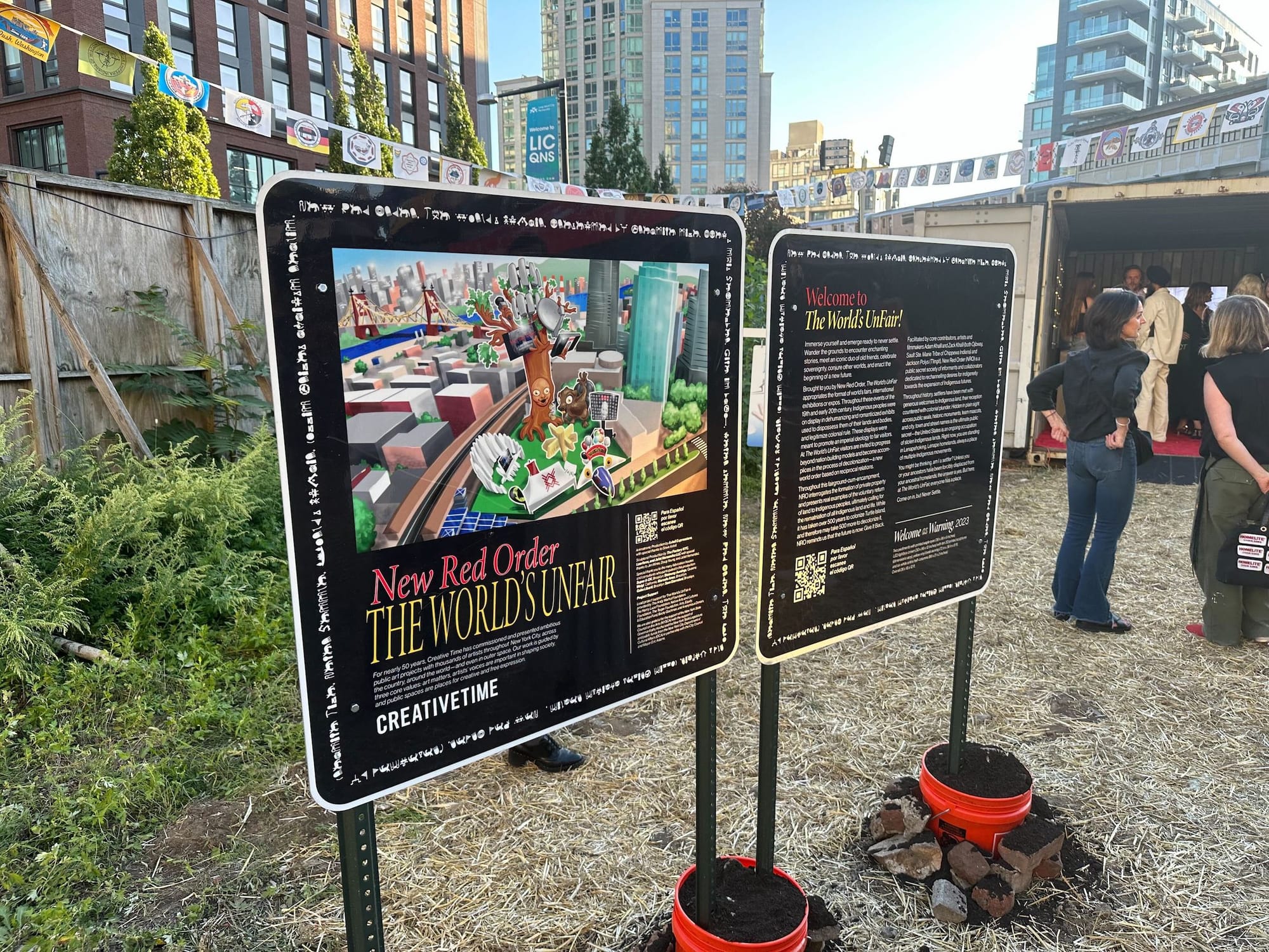 In the twilight hours of Thursday, September 14, a line of people anxiously waited outside a straw-filled lot on Jackson Avenue in Queens for the opening night of The World’s UnFair, an immersive art exhibition by the self-proclaimed “public secret society” New Red Order (NRO). Focusing on land rematriation, the forced displacement of Native peoples, and colonialism embedded within the capitalistic real estate industry, the project is a satirical carnival centered around the call to give land back.