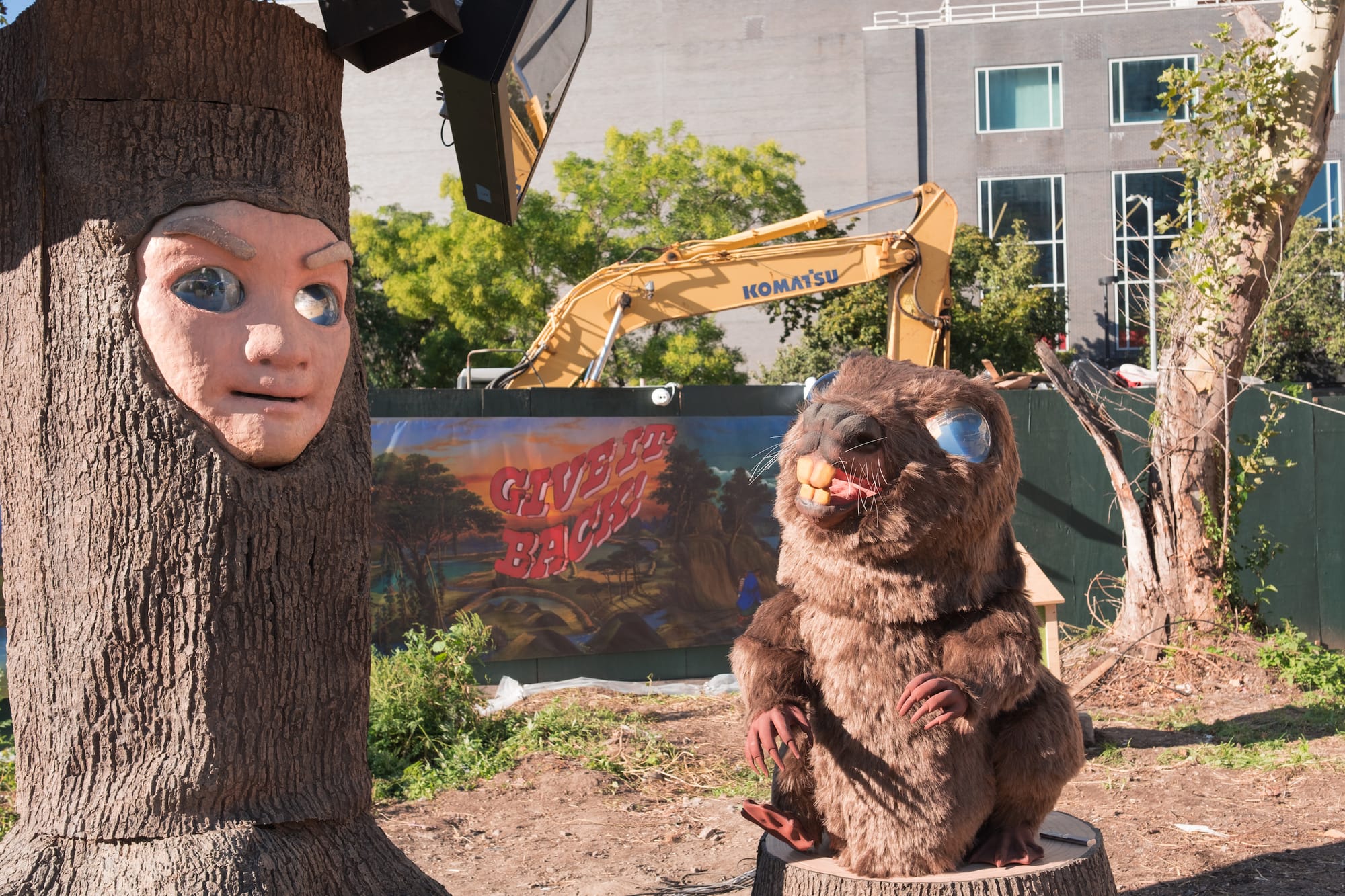 At the heart of The World’s Unfair is a very clear call to action, which is not only communicated through the artworks’ message displays, philosophical discussions between an animatronic beaver and talking tree in “Dexter and Sinister” (2023), or the large-scale video sculpture “Fort Freedumb” (2023), but also directly encouraged through QR codes linking to fundraisers and organizations supporting land repatriation.