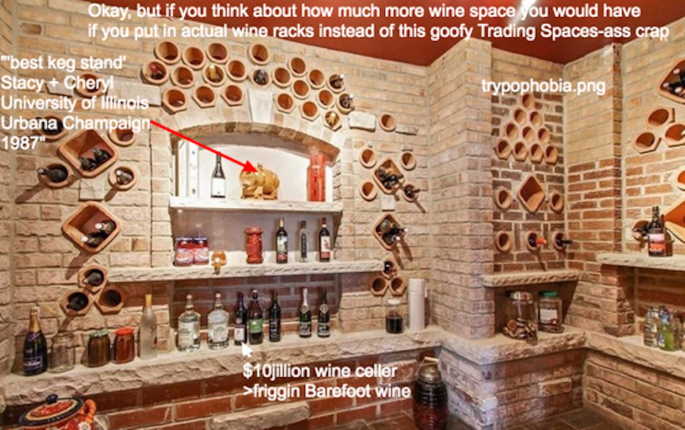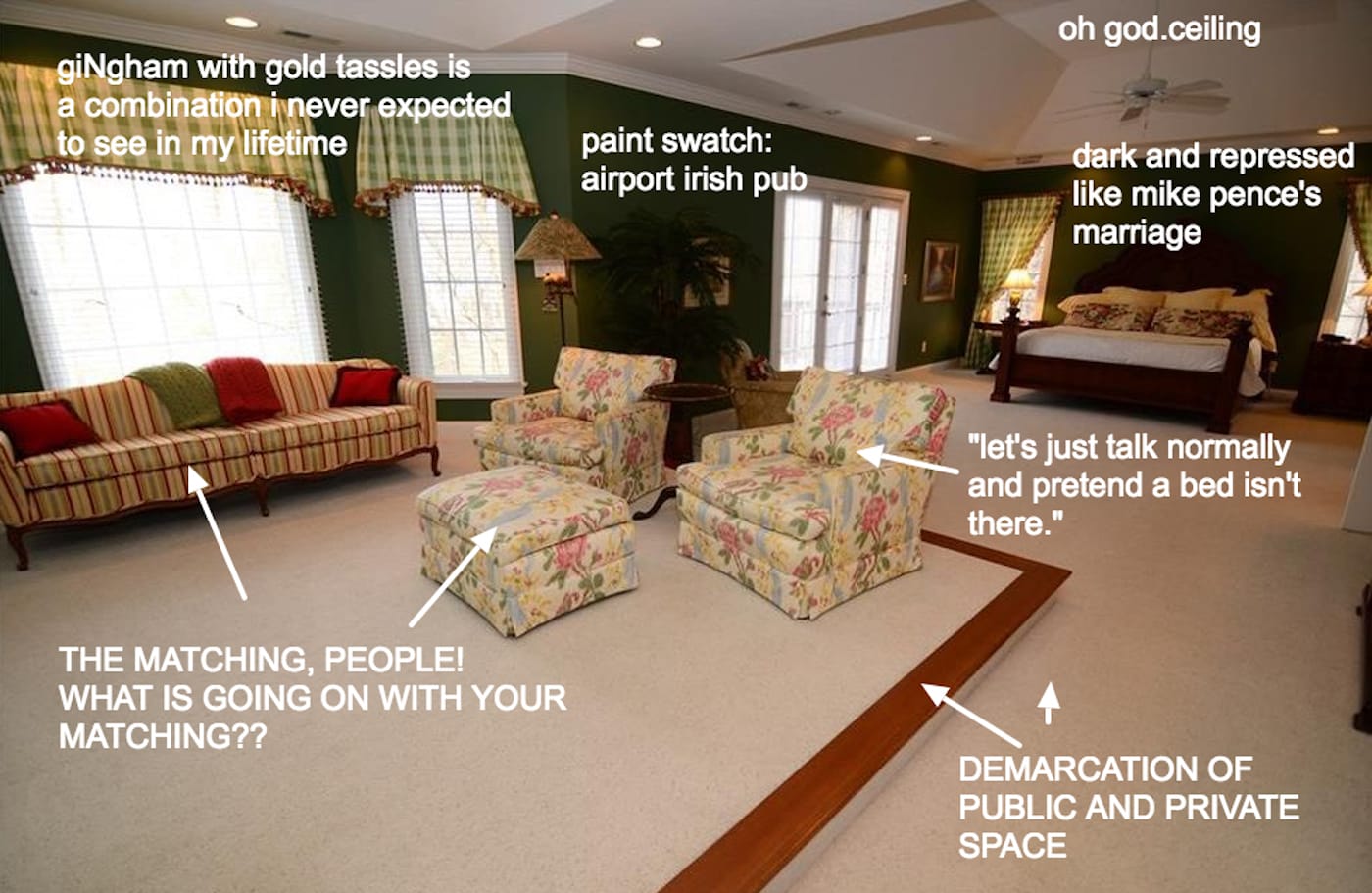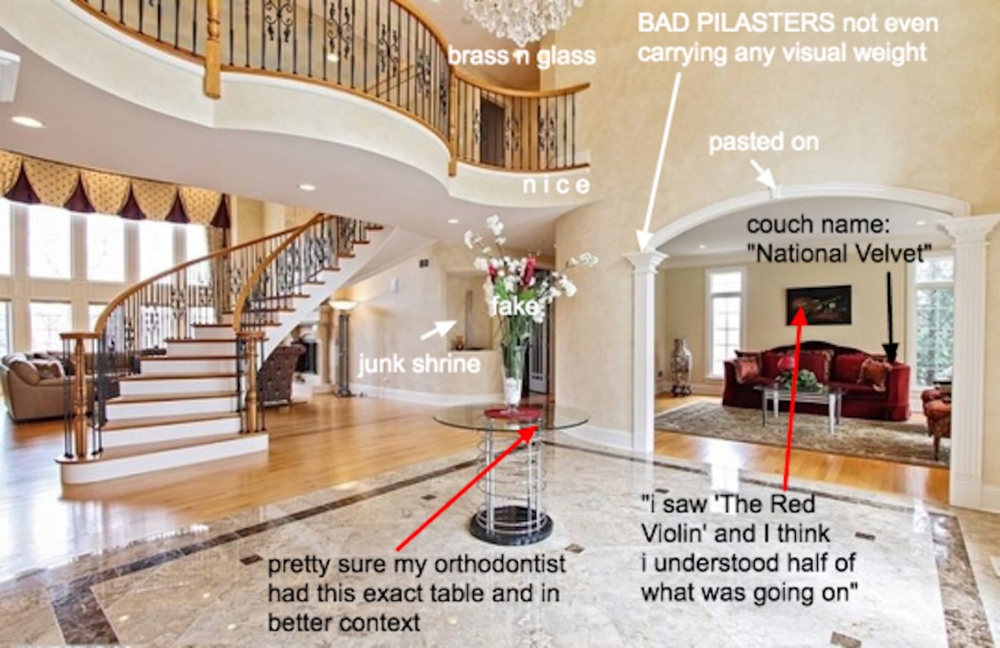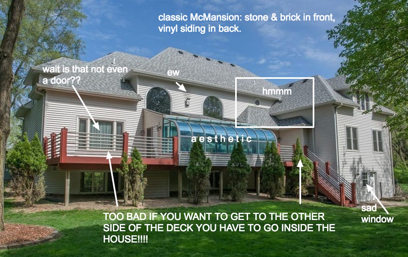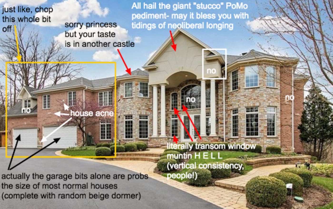 Eastlake, like many in his cohort, was a snob. And Wagner takes pains to distinguish her project from the Design Reform movement in both spirit and tone. If there’s any snobbery to McMansion Hell, it’s not born of wealth inequality, but of the gulf that divides those who acknowledge and adhere to architectural norms and those who do not. Wagner has no interest in denigrating the struggling or the working poor: “It’s unproductive to be condescending to working-class people who can’t afford hand-milled furniture or don’t want to live in machines because they work in machines,” she tells Hyperallergic. “Class politics are at the center of MMH. The irony of today is that the wealthy can’t say, ‘poor dears, they don’t know any better,’ because the wealthy certainly don’t know any better, as proven by McMansions all over the world.” It’s not just any wealthy homeowners that attract the attention of MMH, but the population that Wagner characterizes as “the white-collar working class.” Bluebloods are apt to prefer historic houses filled with well-chosen folk art and heirlooms, or a solidly built fixer-upper with good bones if their money is thin. A McMansion would be anathema to them at any price.