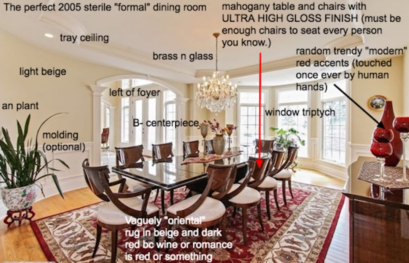 Wagner is a graduate student in acoustics as part of a joint program between Johns Hopkins University and Peabody Conservatory, with prior experience working as a sound engineer. She started McMansion Hell in July 2016 in an effort to elucidate precisely what it is that makes McMansions distinct as a typology (something architects love) and to make readers understand where the critique comes from, both culturally and economically. In this, Wagner is a bit like a modern-day design reformer. Advocates of the Design Reform movement, which emerged from a rapidly industrializing Victorian Britain with Prince Albert as its royal mascot, argued that taste was something one could identify and describe almost scientifically, rather than something derived from the vagaries of personal preference. Things like wallpaper and carpeting that tried too hard to effect three-dimensionality, cheap or ersatz materials imitating good or genuine ones, wacky proportions, and the use of ornamentation to gaudy excess all offended the reformers, who preferred elegant, semi-abstract iterations of natural forms. Their rallying cry to craftsmen and consumers everywhere was “truth to materials.” In his 1868 book Hints on Household Taste, architect and designer Charles Eastlake wrote: “The quasi-fidelity with which the forms of a rose, or a bunch of ribbons, or a ruined castle, can be reproduced on carpets, crockery and wallpapers will always possess a certain kind of charm for the uneducated eye.”
