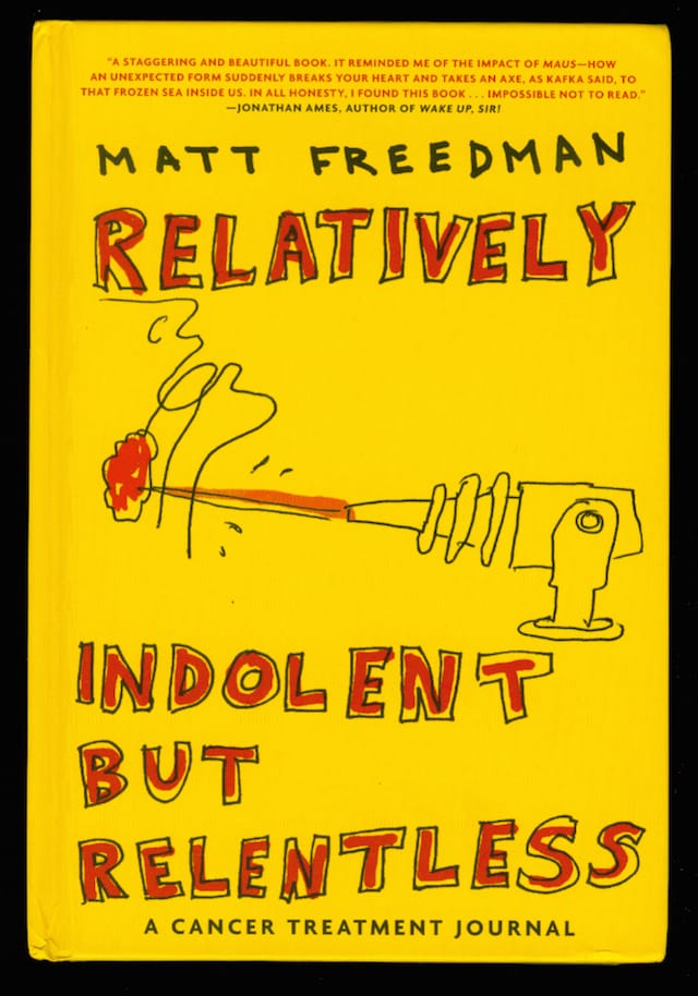 The artist Matt Freedman passed away in October, eight years after undergoing a 35-day course of treatment at Massachusetts General Hospital for adenoid cystic carcinoma, a rare form of cancer that began in his tongue and spread to his neck and lungs. The word “treatment,” however, is risibly benign. As he wrote in Relatively Indolent but Relentless: A Cancer Treatment Journal (Seven Stories Press, 2014), by day 28 of the ordeal: