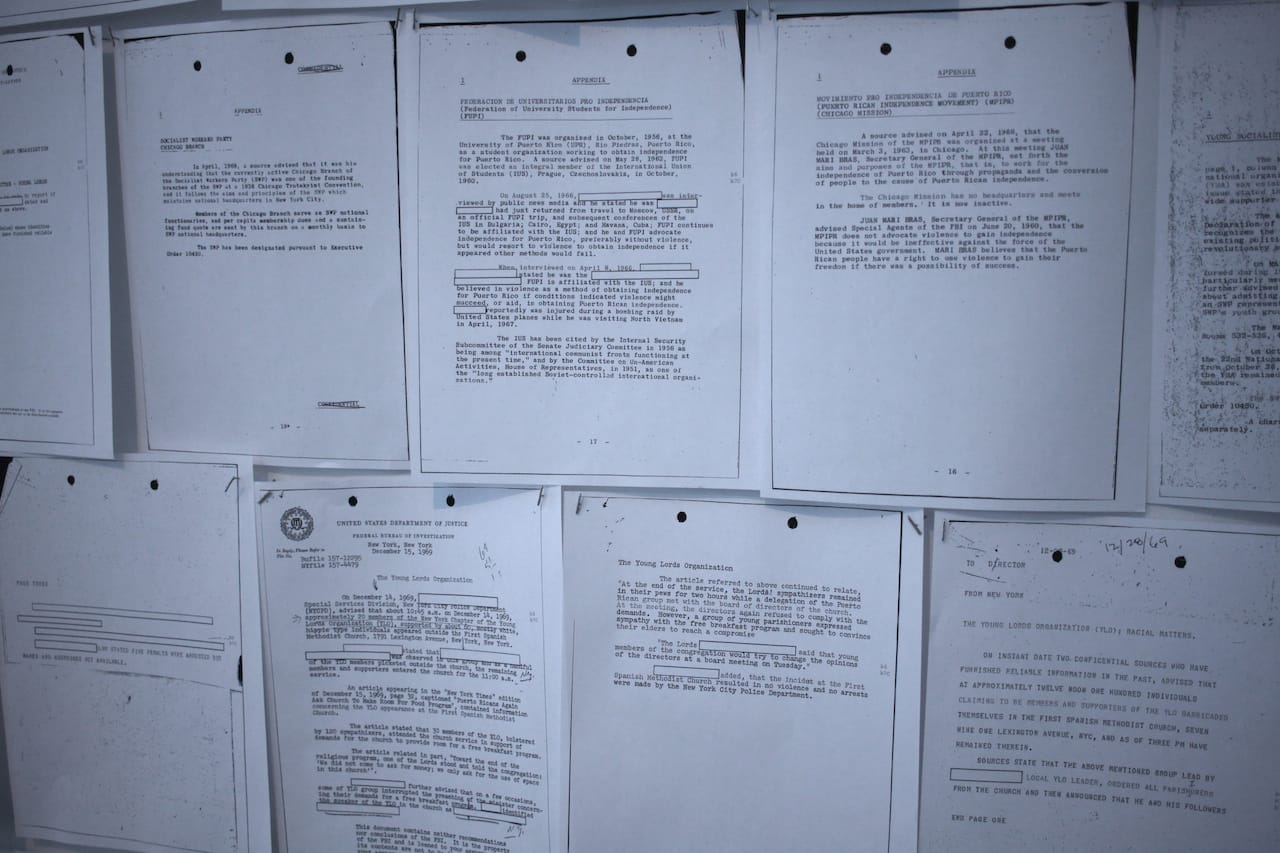 Legal and photographic documents, including a wall plastered with photocopies of FBI documents, highlight the intimidation the activists must have felt in their pursuit of social justice. The radical community galvanized by the Young Lords — first in Chicago, then New York — is likewise documented through photography peppered throughout the exhibit, including work by Michael Abramson and Fred W. McDarrah.