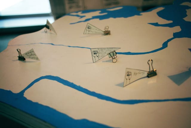 In the museum’s lobby, an interactive piece invites visitors to flag different “points of struggle” on a tabletop map of New York’s five boroughs. Some of these points on the map represent moments in the public consciousness, such as the lone flag on Staten Island indicating the site of Eric Garner’s death. Other points cryptically tell stories of personal struggle, such as “Ricardo Israel 1991-1992 #BlackLivesMatter.”