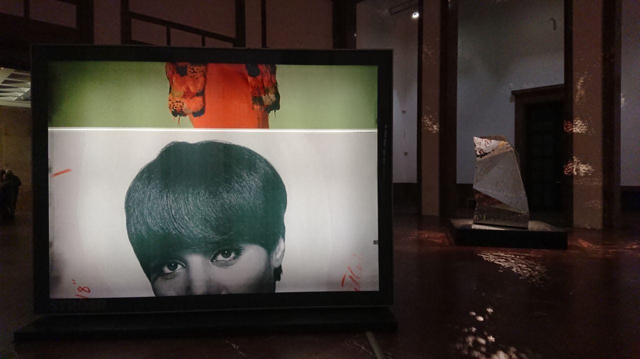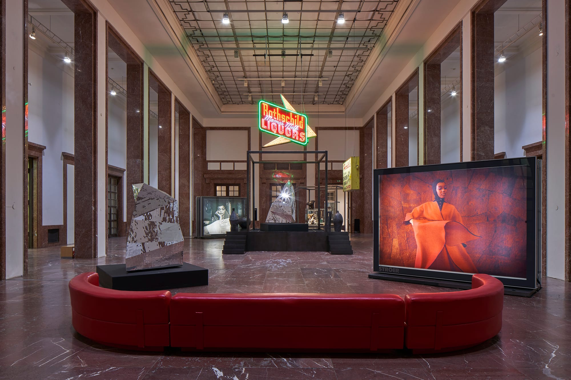 A gesamtkunstwerk encompassing sculpture, photography, sound, and architecture, Black Chapel almost literally transforms the museum into a place of worship. Two mirrored, iceberg-shaped sculptures on rotating platforms — housebergs, as Gates calls them — create a disco-like atmosphere in the central hall while R&B records from the collection of the Black American Olympic sprinter Jesse Owens (1913–80) are softly audible from the adjacent room. Two monumental illuminated advertising boxes fill the room with the presence of gorgeous Black women. The compelling images from the 1960s and ’70s are from the archives of Ebony and Jet, Johnson Publishing Company’s landmark magazines — the first mainstream magazines in the US addressed to Black readers. Gates confronts viewers with Black history in America, as well as systemic racism, by interweaving his installation visually and conceptually with the monumental Haus der Kunst, a major German museum for contemporary art built under Hitler’s orders in Munich in 1933-37.