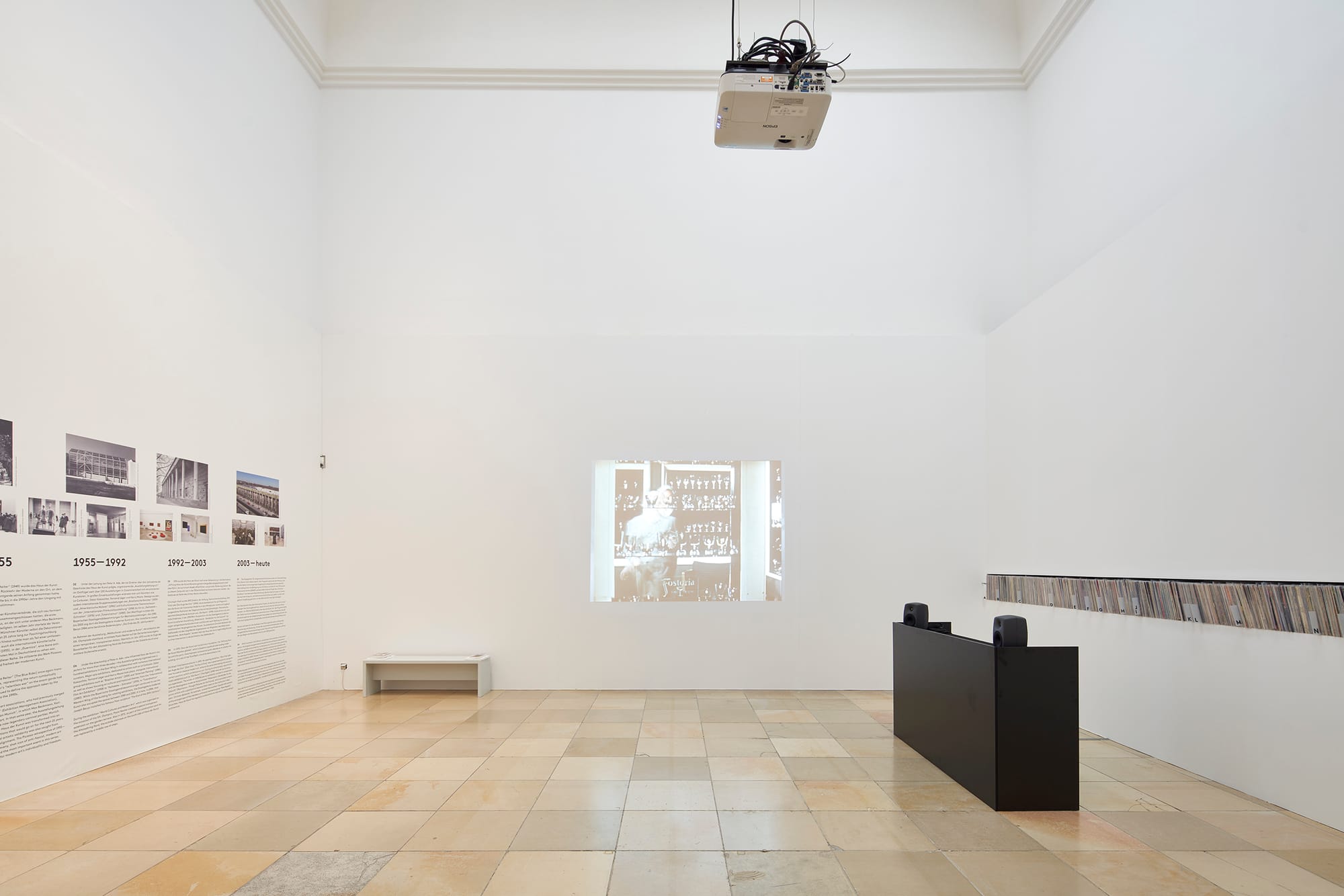 In the adjacent archive gallery are 1,800 LPs owned by Jesse Owens and acquired by Gates after Owens’s death, lined up in a meter-long wall niche, across from a wall text detailing the building’s Nazi history. A short video by Leni Riefenstahl projected onto the connecting wall shows excerpts from Owens’s triumph at the 1936 Olympics in Berlin, where he won four gold medals. The paths of Jesse Owens and Leni Riefenstahl crossed again in 1972, when both traveled to the Olympic Games in Munich. For Haus der Kunst, Gates montaged heroic scenes of Owens running past a white competitor, filmed by Riefenstahl and commissioned by the Nazis, with scenes from the everyday lives of Black people in the 1930s.