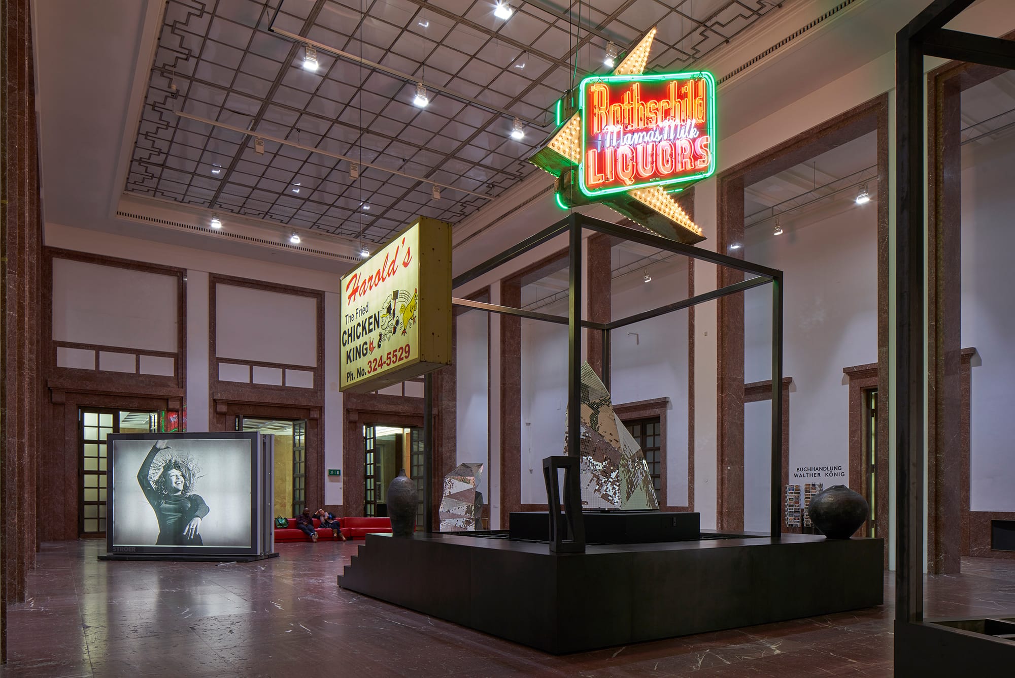 Gates is known for his large-scale urban interventions — for his Dorchester Projects, in Chicago’s South Side, he renovated abandoned buildings to create new spaces for art, research, and affordable housing. By adopting the museum’s formal language with Black Chapel, Gates draws attention to its painful architectural history: The hall, where Adolf Hitler once gave speeches, is now a site of encounter with Black history. In the middle, suspended from the high ceiling, are American business signs; a neon sign reads, “Rothschild Liquors” and “Mama’s Milk” and a lightbox sign reads, “Harold’s, the Fried Chicken King.”