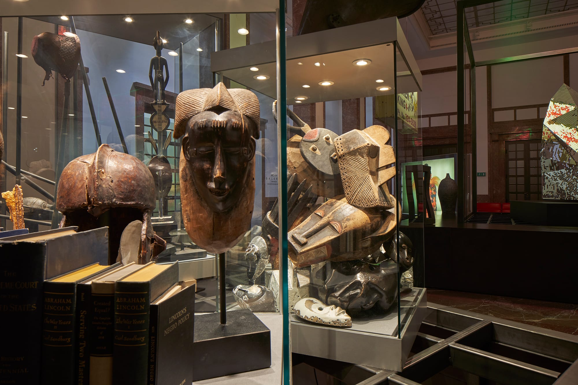 The masks are presented with small signs denoting those from tourist markets and those made by Gates. They are juxtaposed with American history books that focus on the American Civil War period, such as Abraham Lincoln: The War Years by Carl Sandburg (1939) and  Lincoln’s Negro Policy by Earnest Sevier Cox (1938). Gates references the racism embedded in modernism’s failure to adequately acknowledge non-white sources of inspiration as well as current discussions in museums about the repatriation of cultural objects. In doing so, he beckons questions of where these objects come from and what, exactly, they are. To what extent are viewers really familiar with American history? The entire installation seems designed not only as a matter of cultural emancipation but also an urge to reflect and to seek out knowledge.
