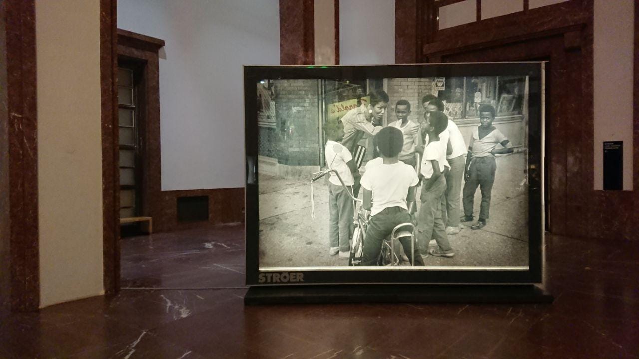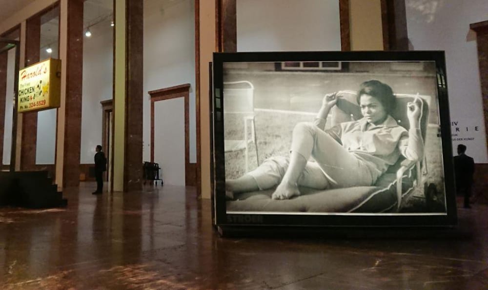Signs made by the German company Stöer used in the exhibition will be familiar to Munich residents, subtly calling to mind previously seen advertisements. Interior and exterior space thus interpenetrate each other. Here, though, the context serves to question the viewing habits of the predominantly white European viewers, many of whom will likely remember the Stöer signs. With which images do we surround ourselves? Gates offers a counter-image to the white-dominated media industry.