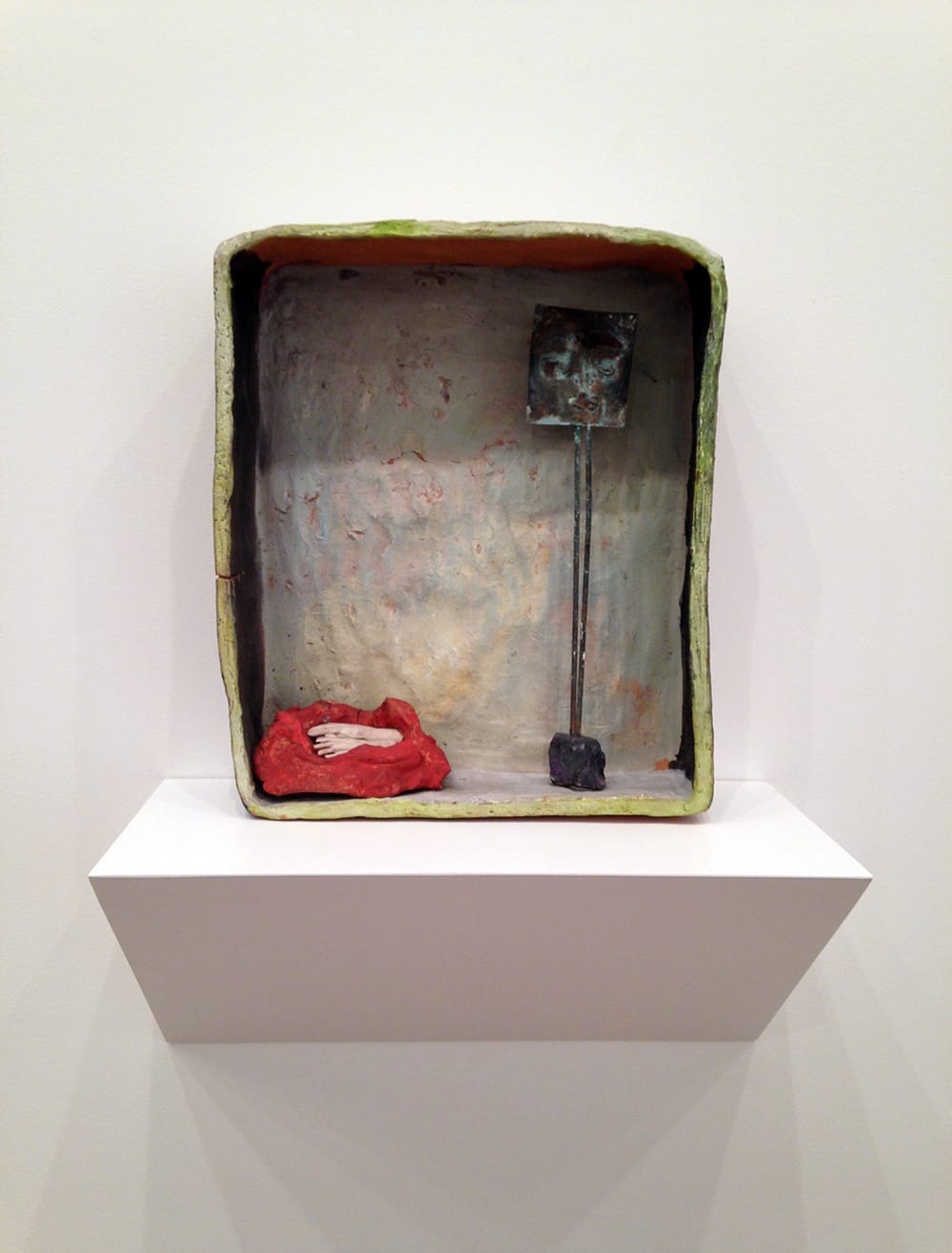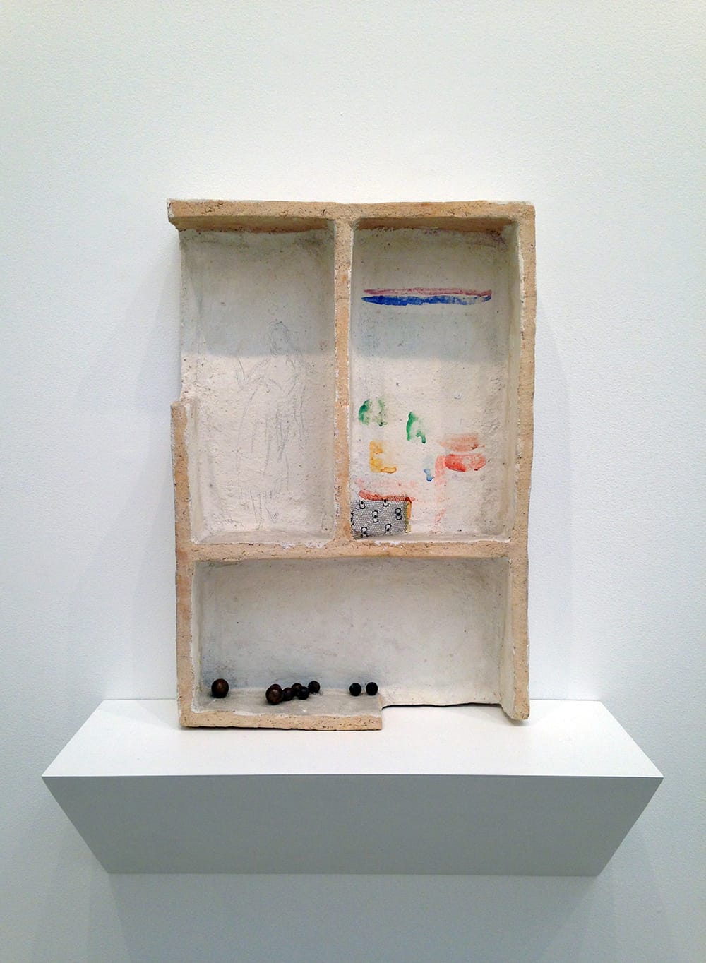 Of these, the “teatrini,” or “little theaters” are the best known: compartmentalized relief sculptures, usually in plaster or painted terracotta, in which various objects, both handcrafted and found, are placed like keepsakes in cubbyholes, such as the disembodied pair of hands lying on a clump of red clay in “Le mani” (“The Hands,” 1949) or the tiny brass bells and scrap of mesh in “Primavera” (“Spring,” 1974).