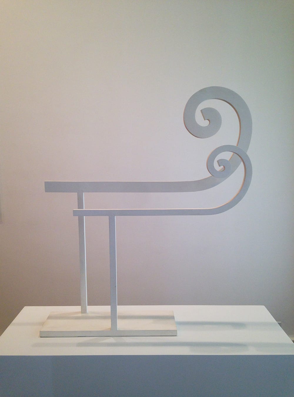 The other two sculptures in the room are both freestanding and made entirely out of poured plaster. “Scultura n. 11” from 1934 is the most technically audacious piece in the show. Two horizontal bars of unequal size terminate at one end in exaggerated spirals, recalling the runners of an old-fashioned sleigh. These are attached on the opposite ends to two narrow, vertical supports; the spirals extend so far in the other direction that they seem on the verge of snapping off, but they’ve stayed put for more than eighty years.