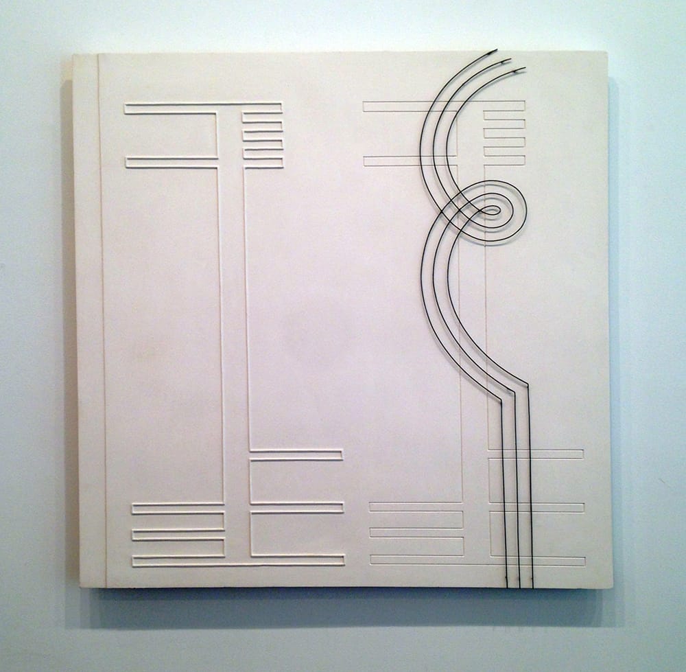 There is one piece, an attenuated rectangle 77 1/2 inches tall in nickel-plated iron, adorned with thin, twisted rods evoking a musical staff, which appears capable of holding its own in an earthquake. The other, far more fragile works are done in poured plaster. There’s one mounted on the wall — a stunning geometric bas-relief (“Scultura n. 24,” 1935 [1968]) featuring two identical vertical struts crisscrossed by horizontal bars — shapes that resemble utility poles or cell towers rising against the white, square surface. Although the forms are the same, the one on the left is embossed and the one on the right is incised. Attached to the shape on the right are three iron rods that curve and loop and straighten as they travel from the top edge down to the bottom.