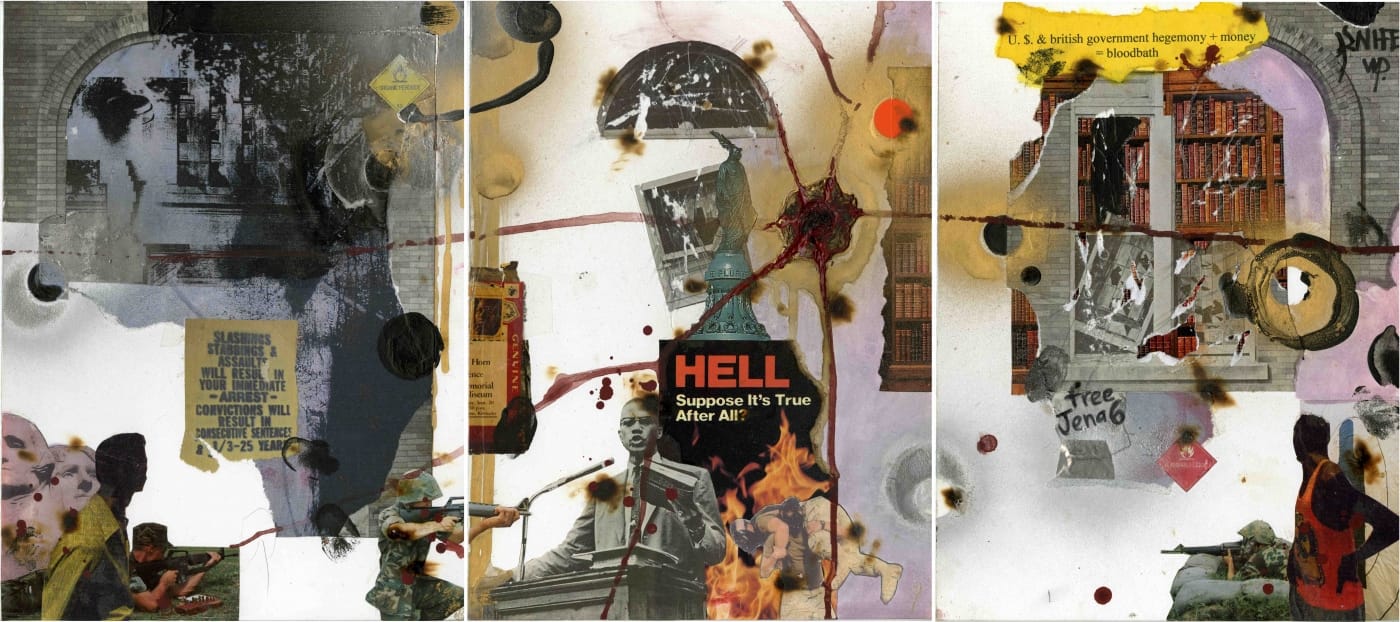 Theodore A. Harris, "War Dialectic" from the Collage and Conflict series (2007), triptych, mixed media collage on board (all images courtesy of the artist and the Center for Humanities at Temple (CHAT))