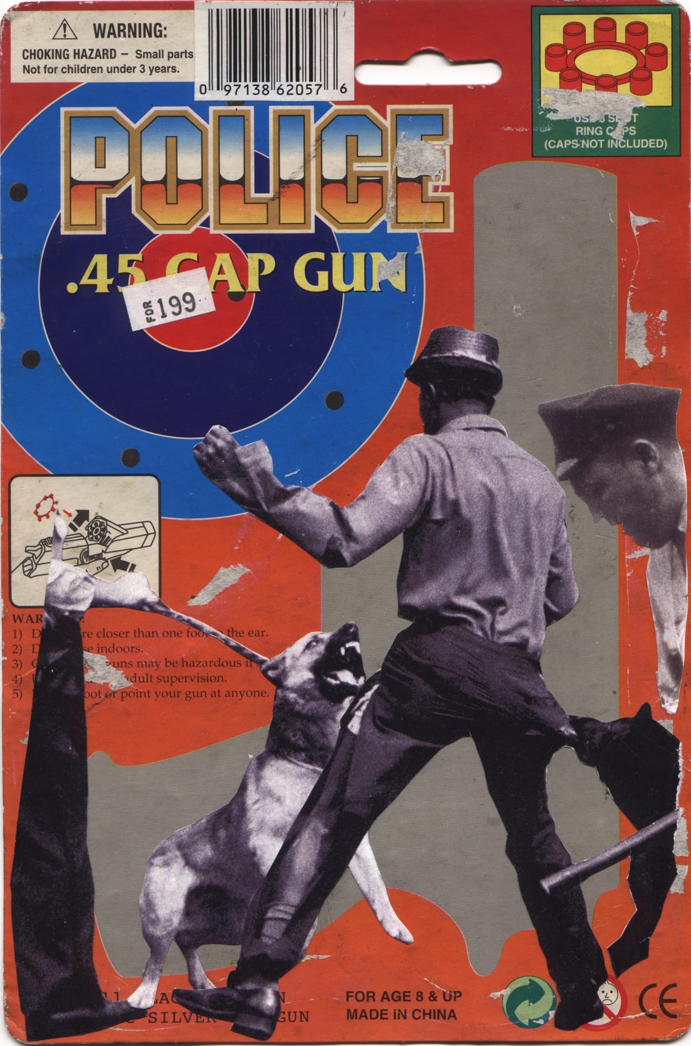 The upper left area of the package contains a bullseye with a few bullet holes, a detail that definitely removes it from the orbit of Jasper Johns’s Pop Art targets. Over the bullseye are the words, “POLICE .45 CAP GUN.” The irony isn’t just that a toy firearm is marketed to a child, but that having the power and authority to mete out justice, like a police officer, is posited as an aspiration. By juxtaposing the gun with some of Ernest Withers’s photographs from the Civil Rights Movement, Harris offers a glimpse of what this kind of justice looks like: police dogs attacking an unarmed black man. Tellingly, the two cops in the image are not truly present. One holds the leash of the barking dog in front of the black man, but this officer has no upper body, only a leg and an arm connected to the leash. The other officer, who appears to be black, is in the foreground and is looking down. Even though we can’t see the face of the black man who is under attack, we know he’s present and paying attention.