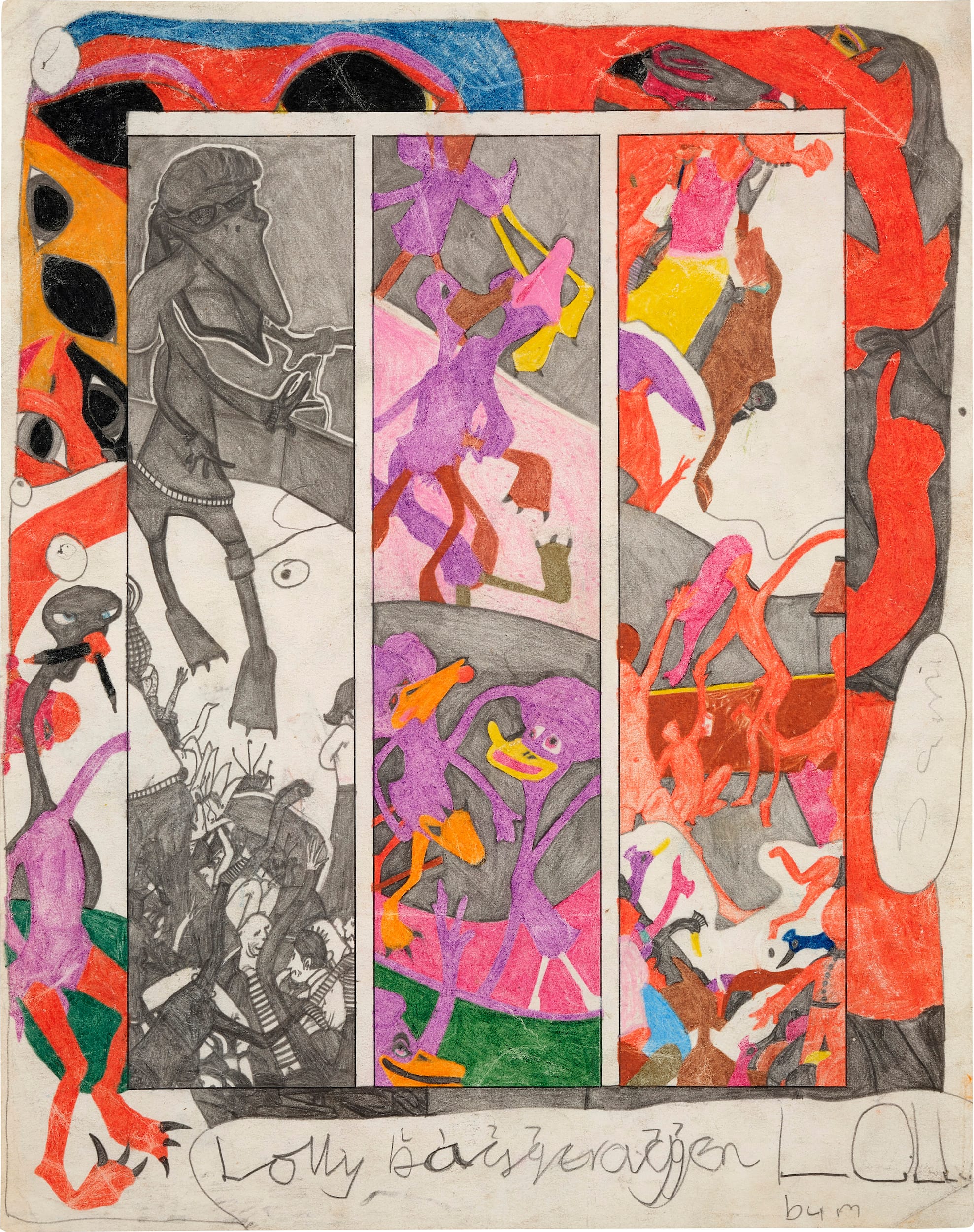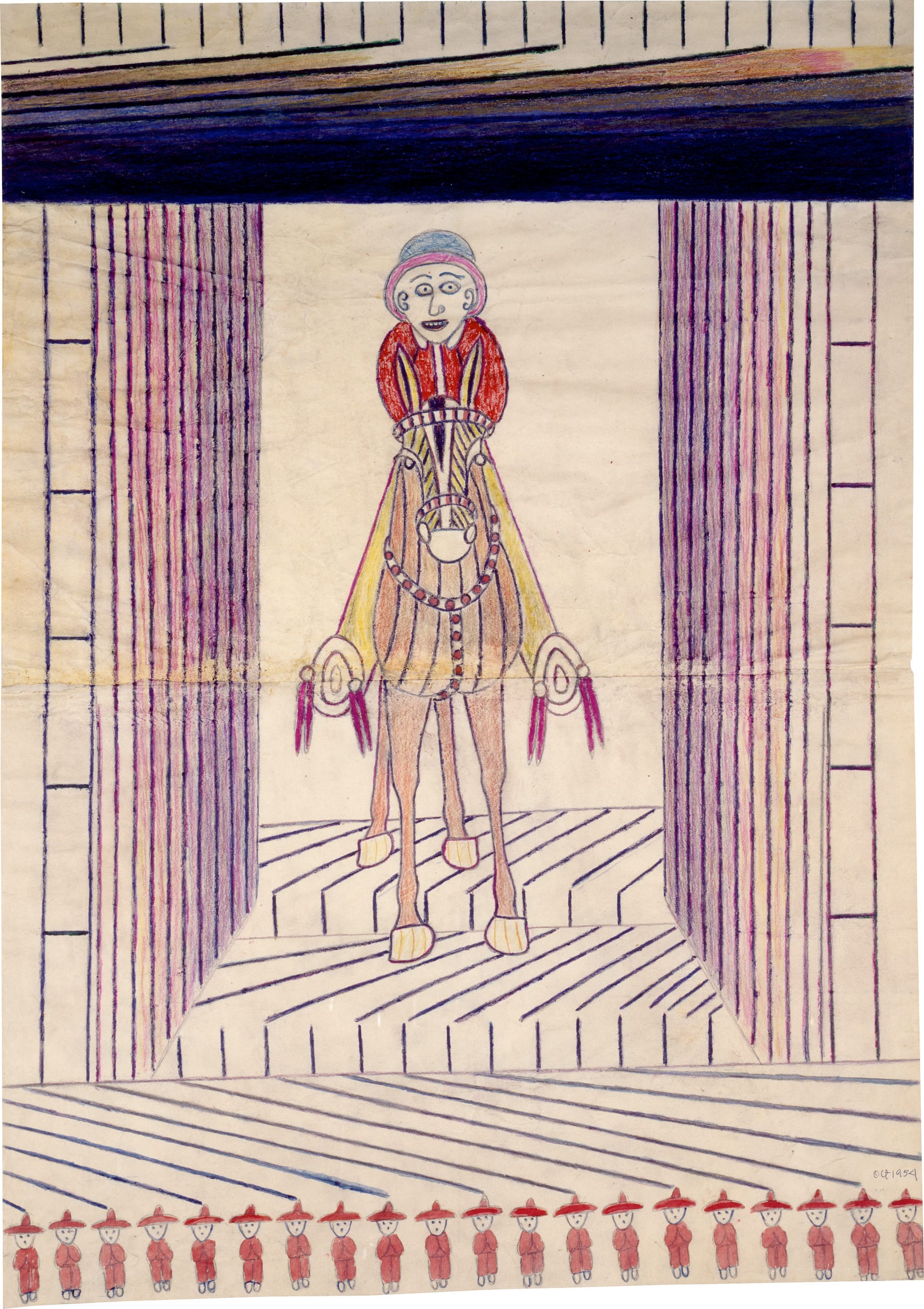 This breakdown of hierarchies goes well beyond that of any exhibition I have seen previously. The show includes drawings by the comic artist Basil Wolverton, who had printed on his stationery, “Producer of preposterous pictures of peculiar people who prowl this perplexing planet”; the repetitive, claustrophobic work of Martín Ramírez, an impoverished laborer who was diagnosed with schizophrenia and institutionalized for much of his adult life; and fashion magazine-inspired drawings of Helen Rae, who was deaf and nonverbal. She began making drawings at the age of 52 at the First Street Gallery and Art Center, an art studio designed specifically for adults with developmental disabilities.