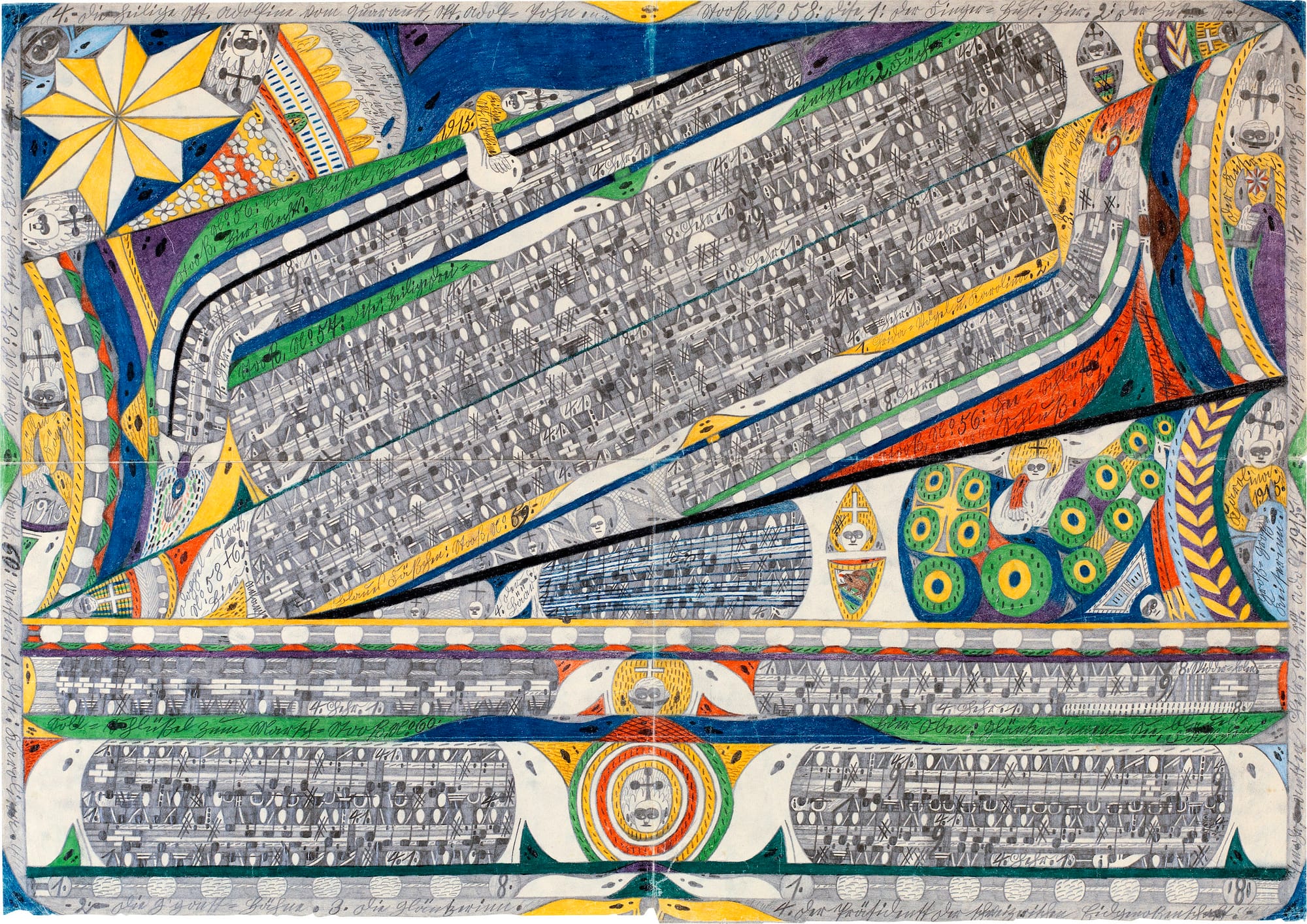 A well-known statement by Philip Guston, who credited it originally to John Cage, came to my mind: “When you start working, everybody is in your studio — the past, your friends, enemies, the art world, and above all your own ideas — all are there.” While both artists seem haunted, it is not clear who was in the room with Henry Darger or Nicole Appel, whose colored pencil drawings of labels and printed matter are among the many highlights of this extraordinary show. What we know of their ideas is in their work, which, for all of its graphic clarity, can feel remote.
