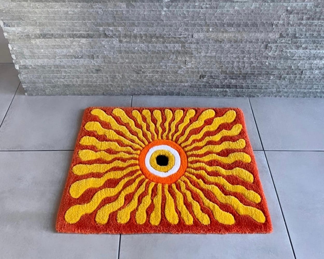 Having relocated to Salt Lake City, Utah from Beirut, Lebanon in 2018, El Gergi felt an urge to keep an open connection to her hometown, which she found through the traditional craft of rug-making. El Gergi articulates how the imagery in her rug designs keeps her in touch with her Lebanese roots: “Habibi Bazaar uses my own personal style, which is Oriental rugs, evil eyes (Nazar), patterns that you would see in churches and mosques in Lebanon,” she told Hyperallergic in an interview.
